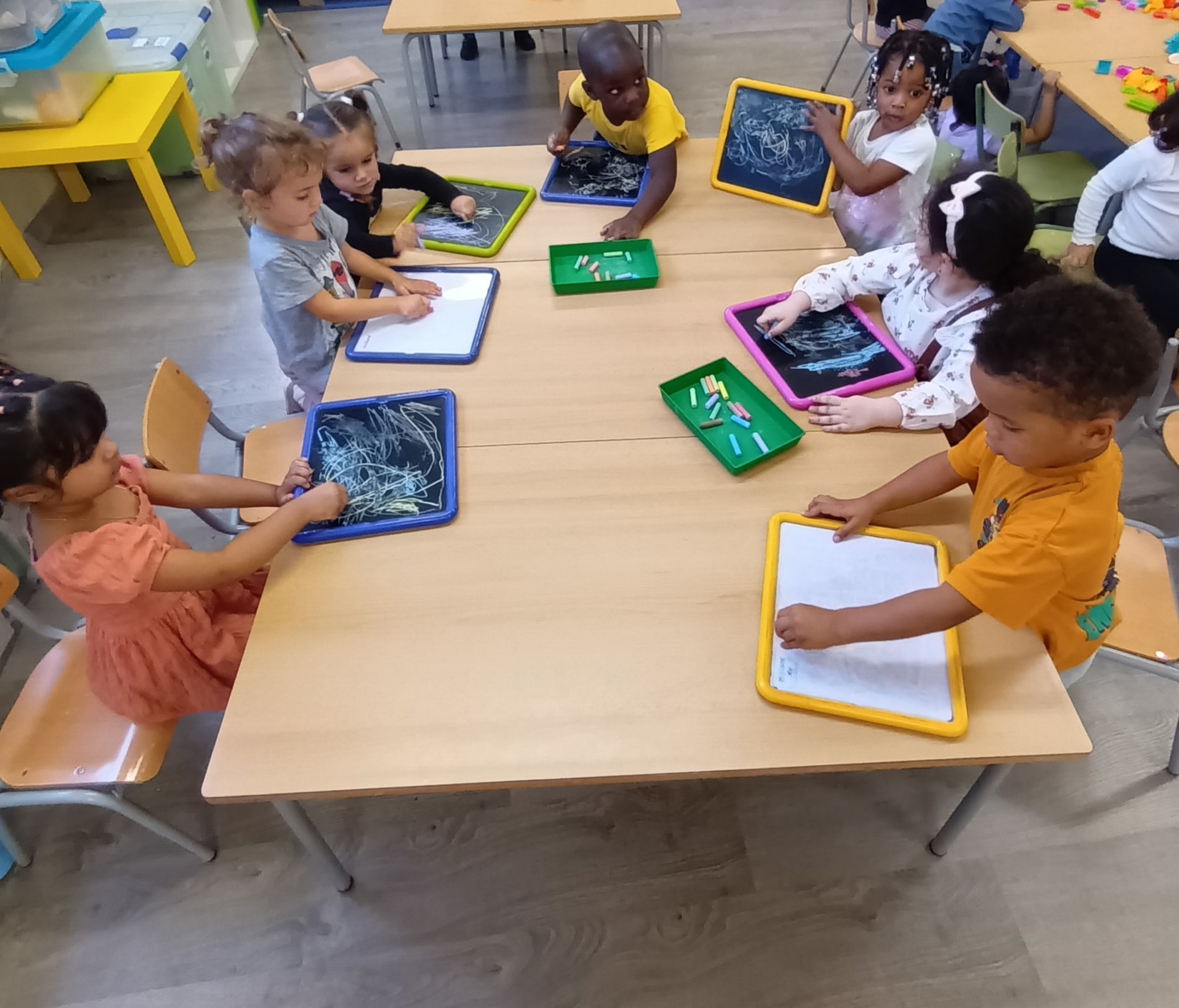 En aquestes activitats hem après a utilitzar diferents estris com retoladors, guixos, ceres, gyottos, plastidecors, llapis de colors, tèmpera sòlida, plastilina…