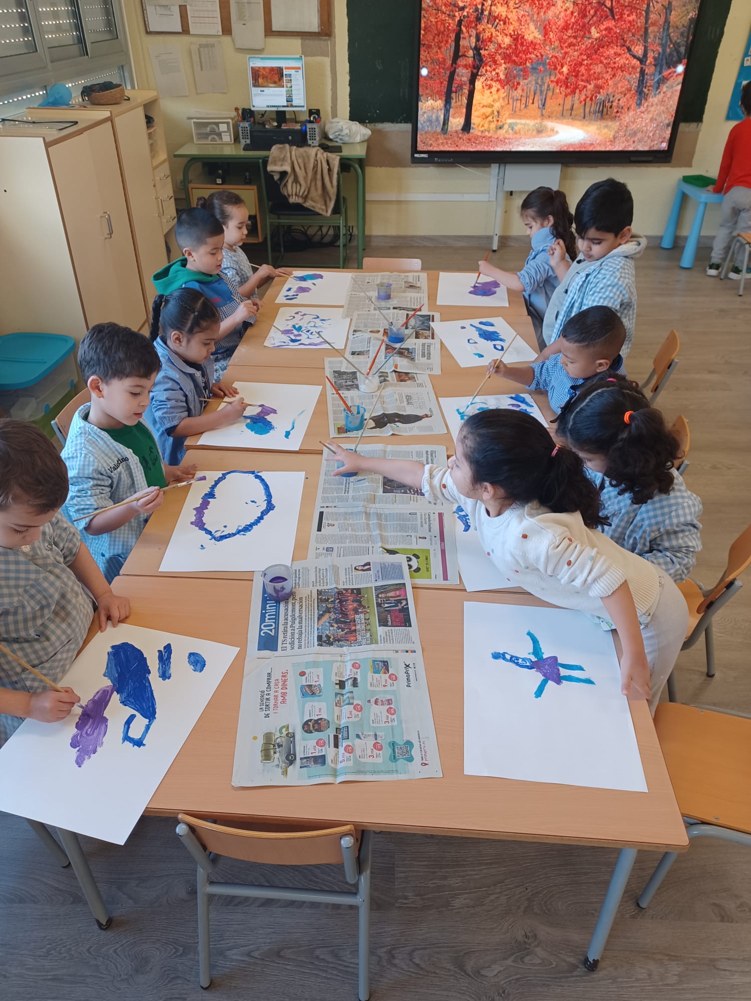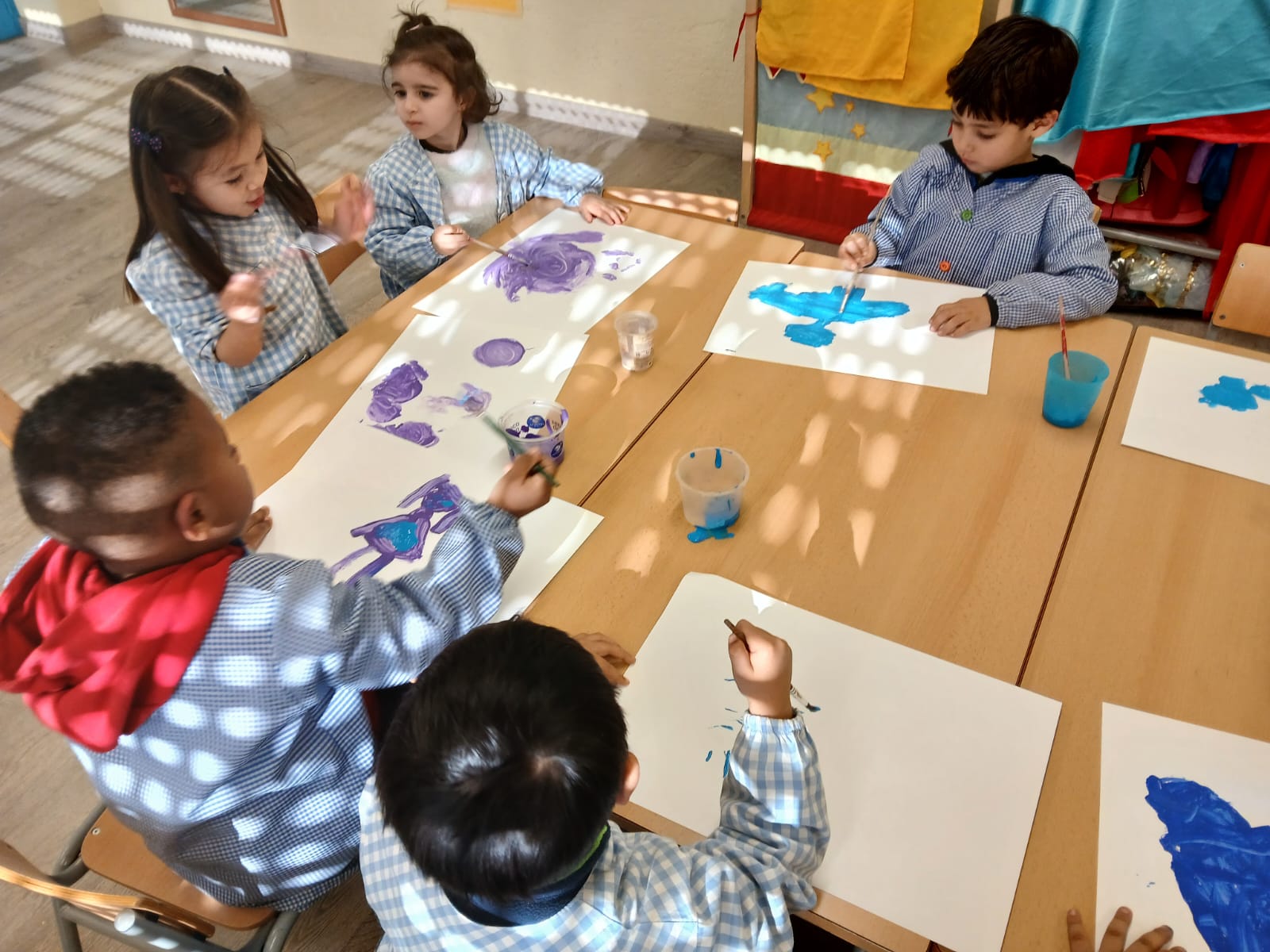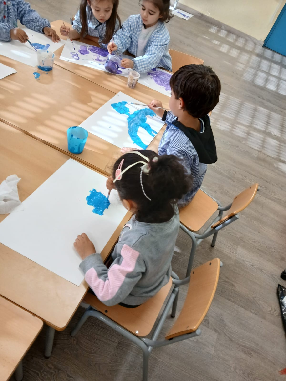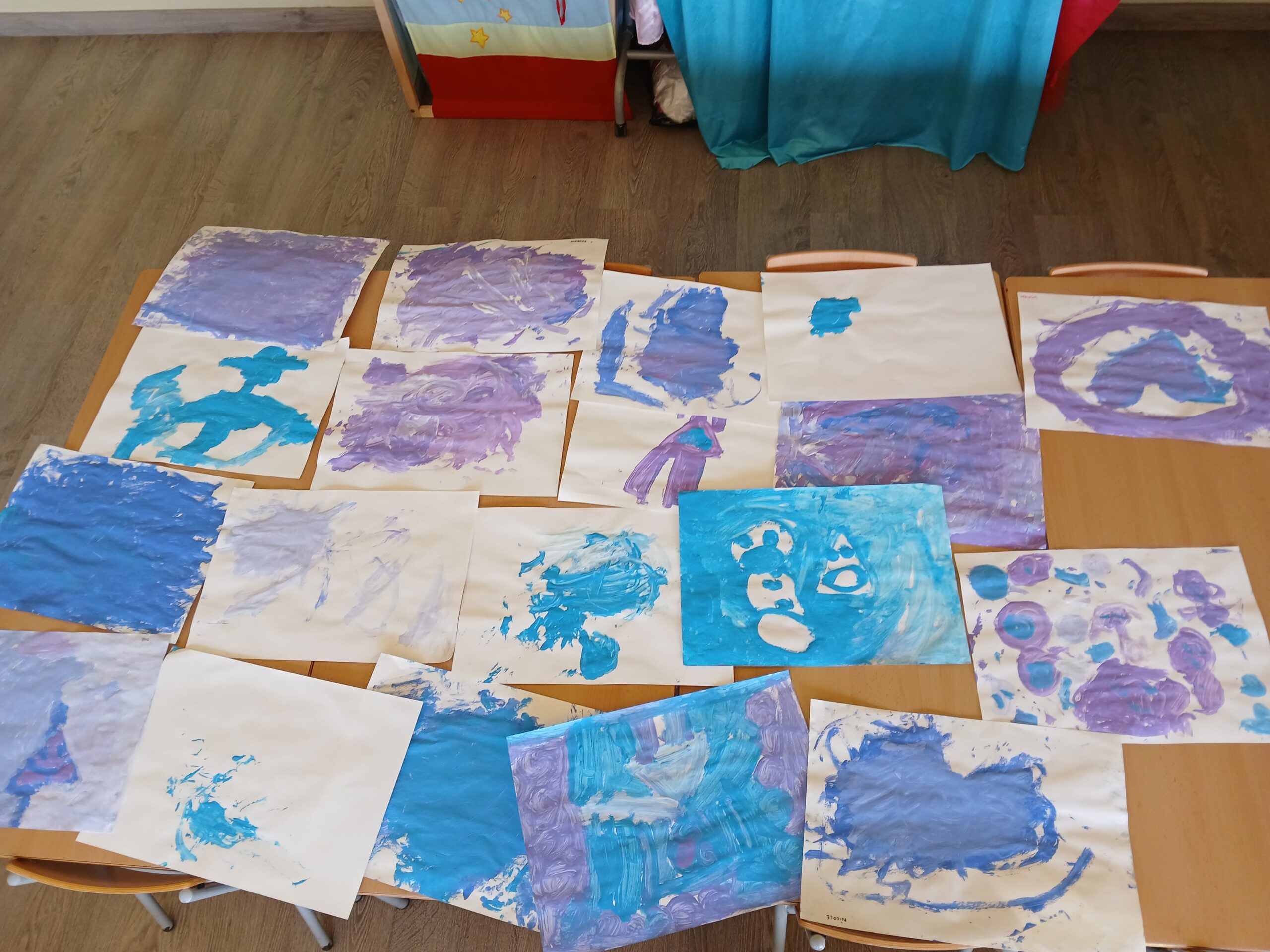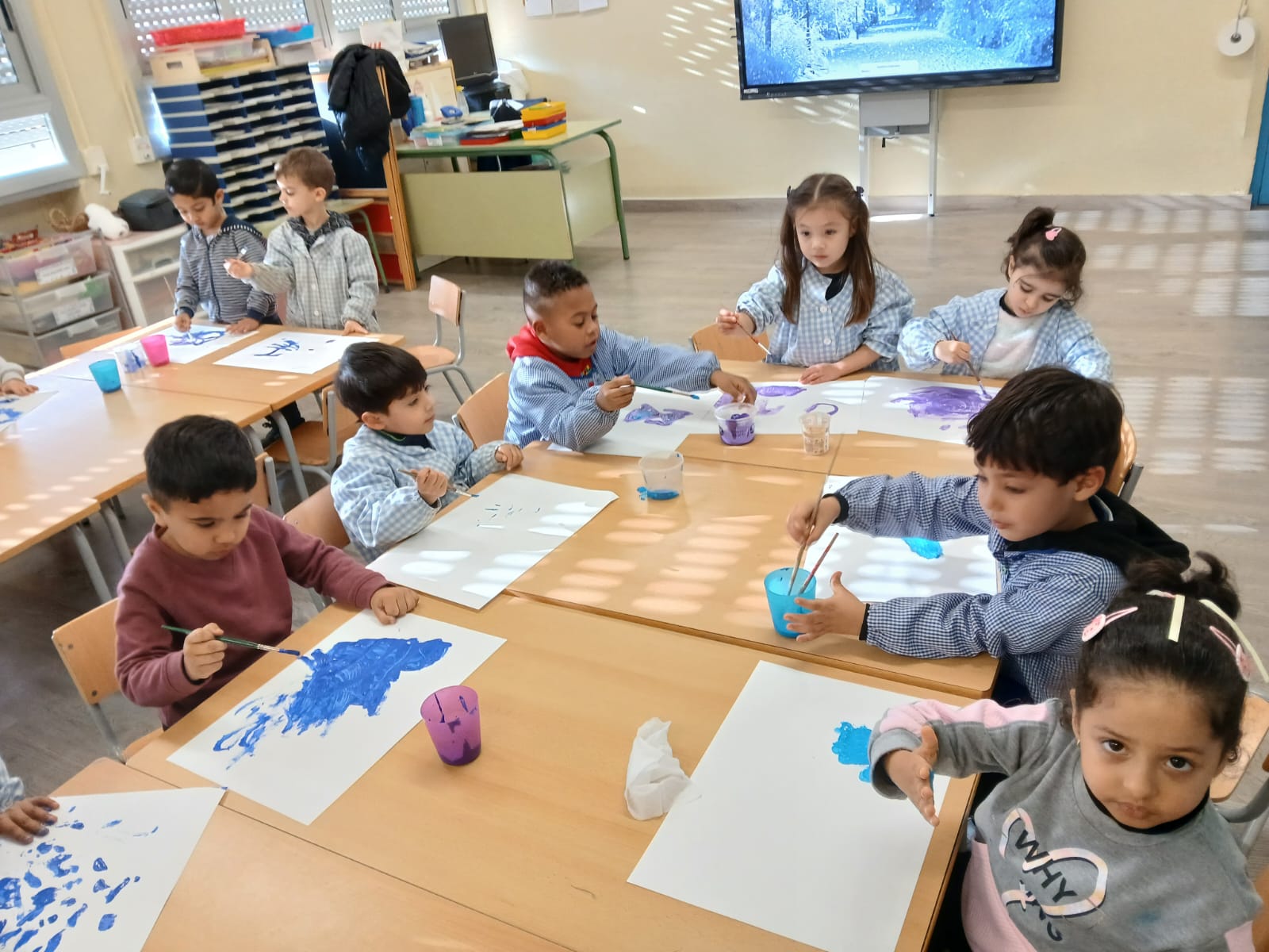 Els infants d’I4 hem gaudit de la pintura dels colors de l’hivern: blau clar, blau fosc, lila i blanc tot dibuixant lliurement mentre escoltaven la cançó de l’hivern de les 4 estacions de d’Antonio Vivaldi.