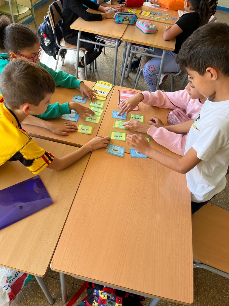 Treballem la Llengua Catalana mitjançant uns tallers, en aquests fem repàs del Gènere i del Nombre. Introduim, també, conceptes nous com els Tipus de Frases, treballem de forma manipulativa i cooperativa.