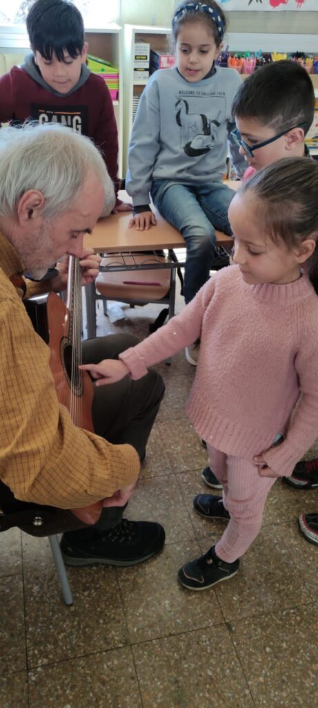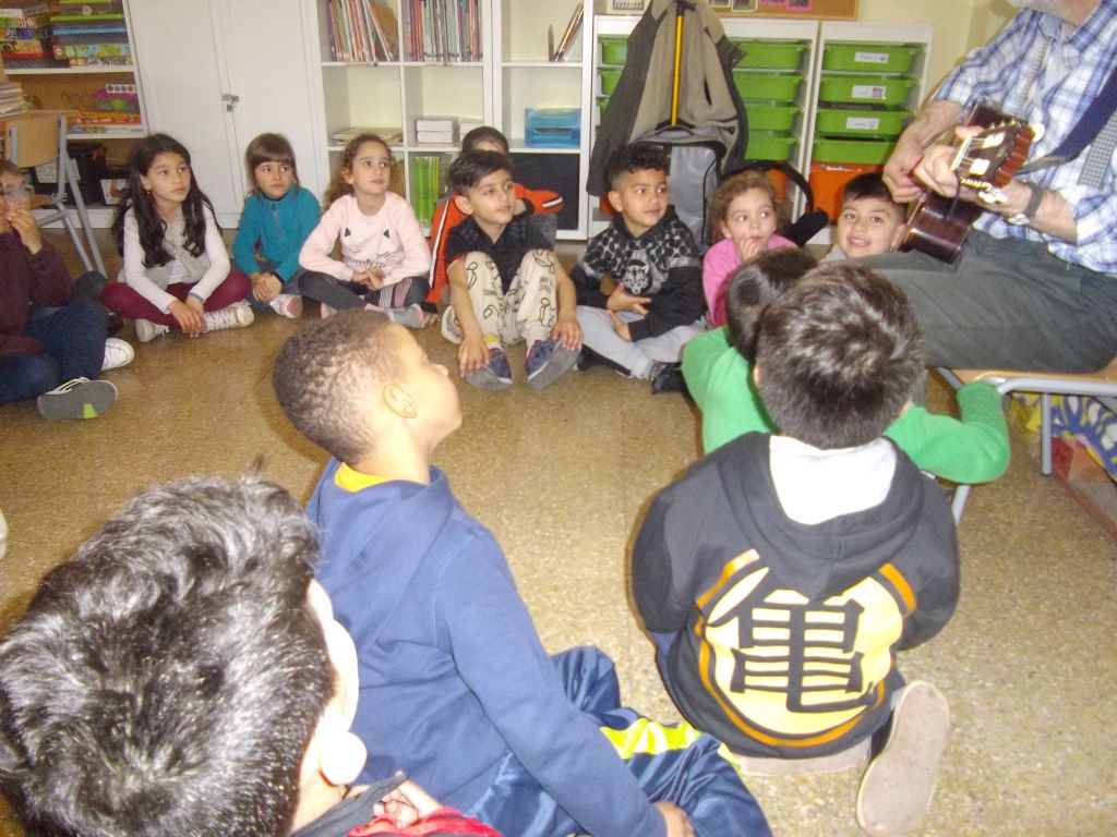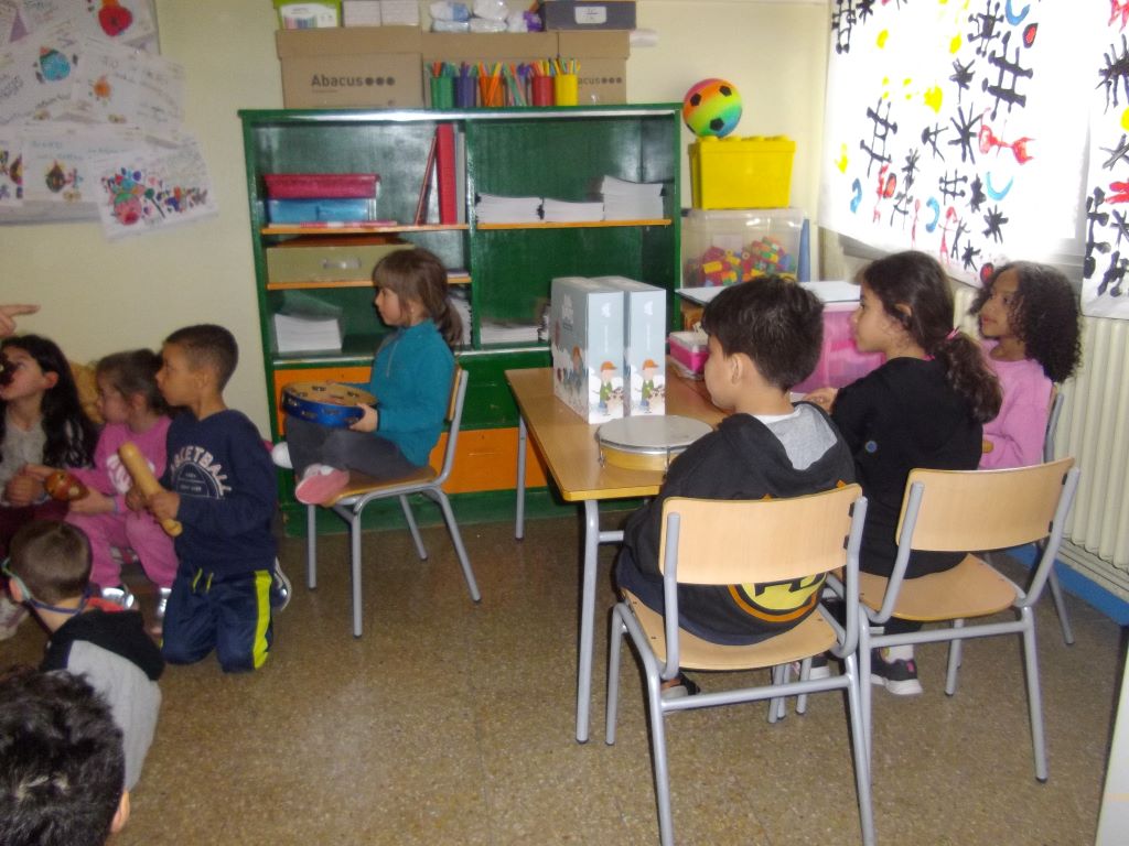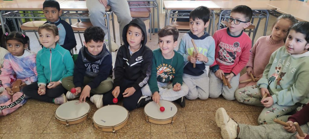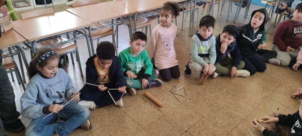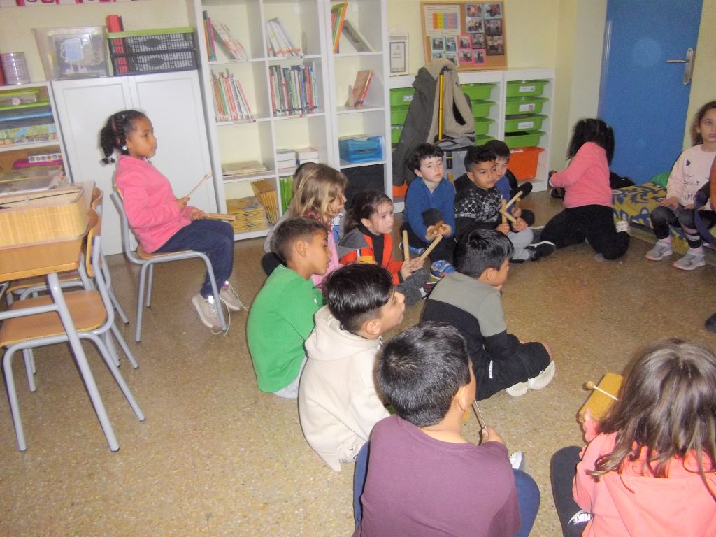 Es convida als infants a col·laborar i generar acompanyament musical a partir de petits instruments de percussió que van compartir entre ells.