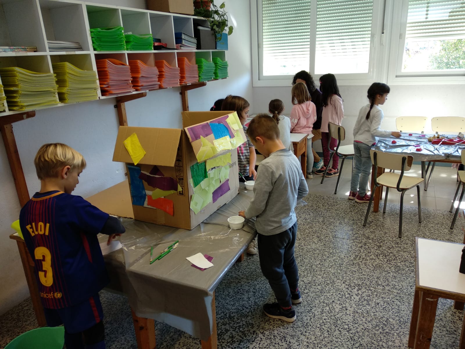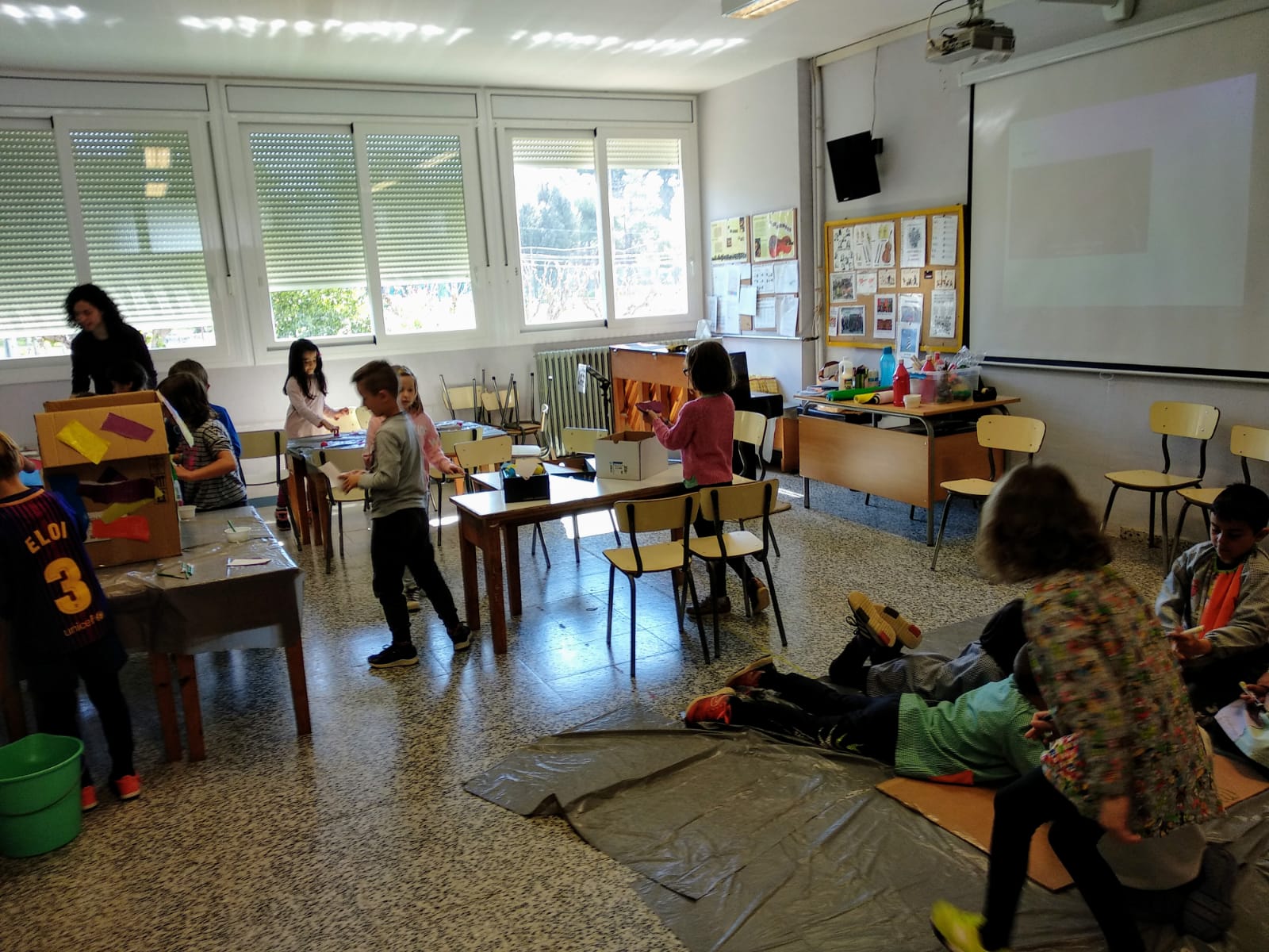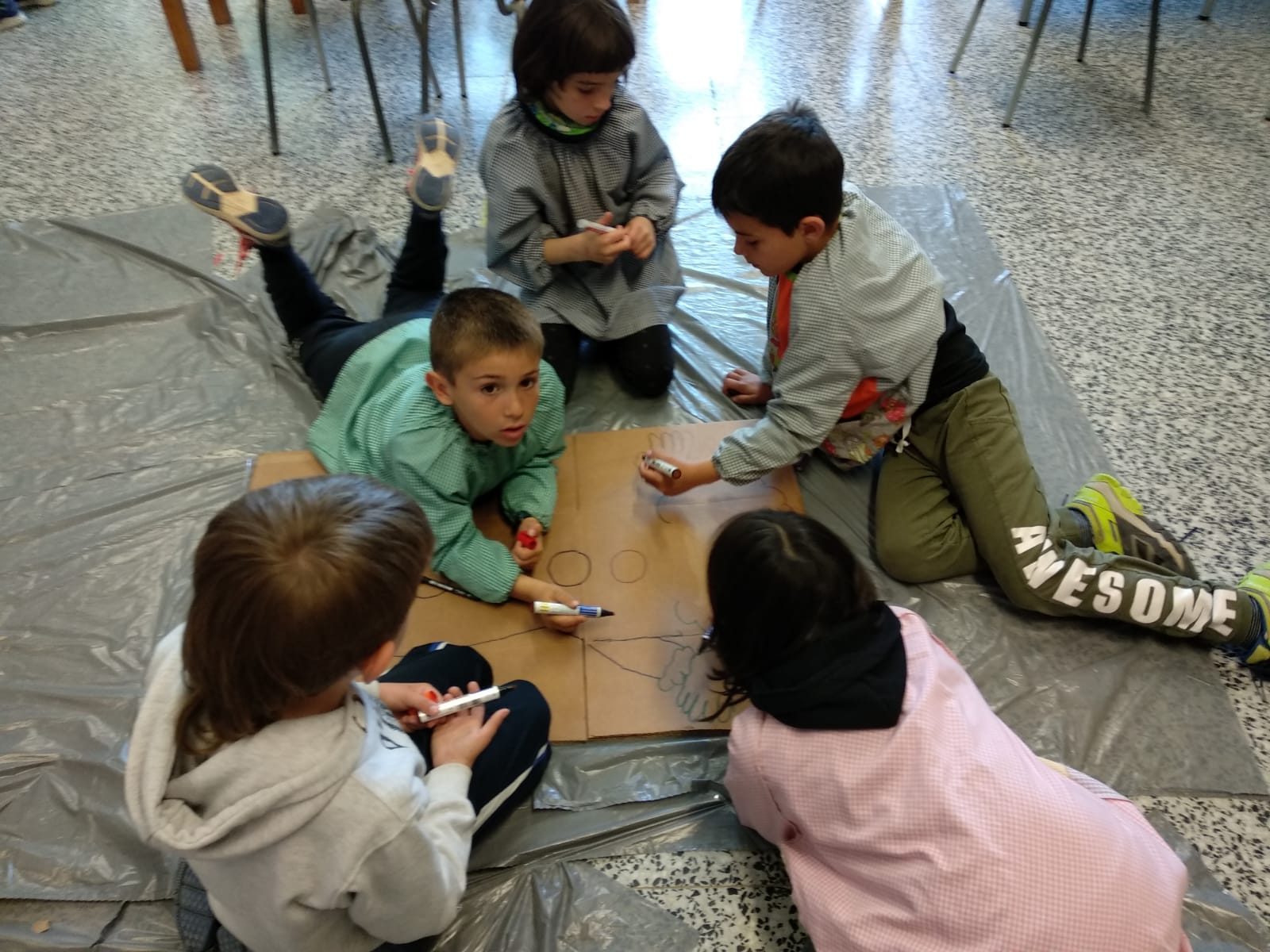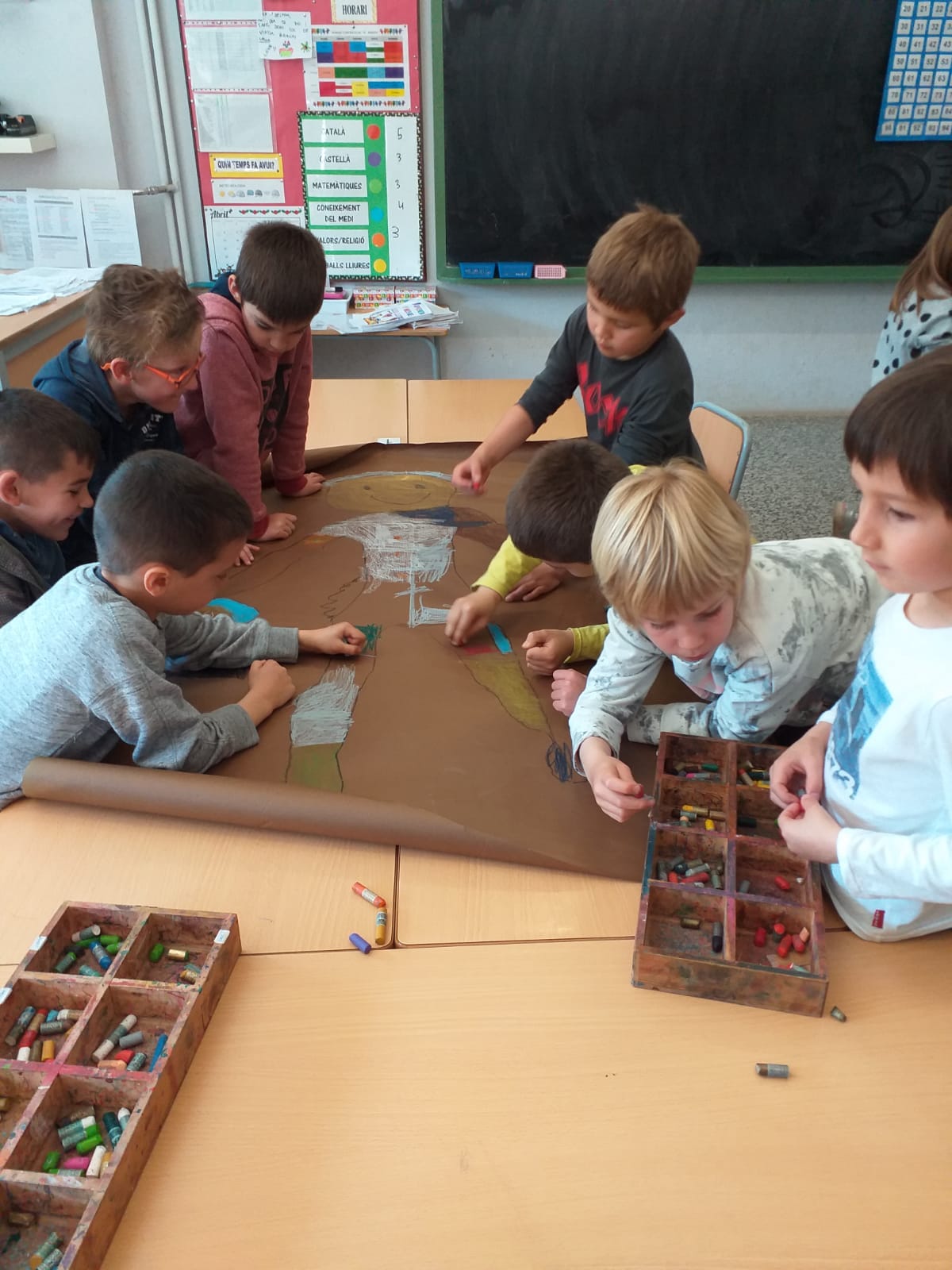 Després d’una estona fent les activitats del circ amb LACRICA hem fet una activitat cooperativament on tots hem vestit diversos personatges del circ. Com que per fer-ho sobre paper no teníem roba, hem decidit que els vestíem de diferents colors. Com que tampoc no teníem els personatges a l’escola, doncs els personatges hem acabat sent nosaltres mateixos.