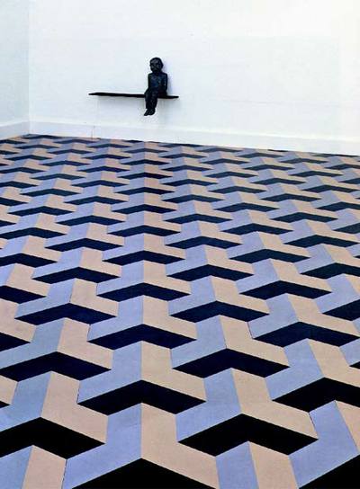 Una de les creacions de Juan Muñoz és aquesta composició amb elements geomètrics pintats al terra amb la figura d’un ventríloc observant-lo. L’autor la va titular: “Terra herm”. Amb aquesta obra, ens vol tranmetre la solitud o fins i tot la desolació de l’ésser humà davant un sòl tant hipnòtic. És molt potent l’efecte òptic que ens produeix en observar-la.