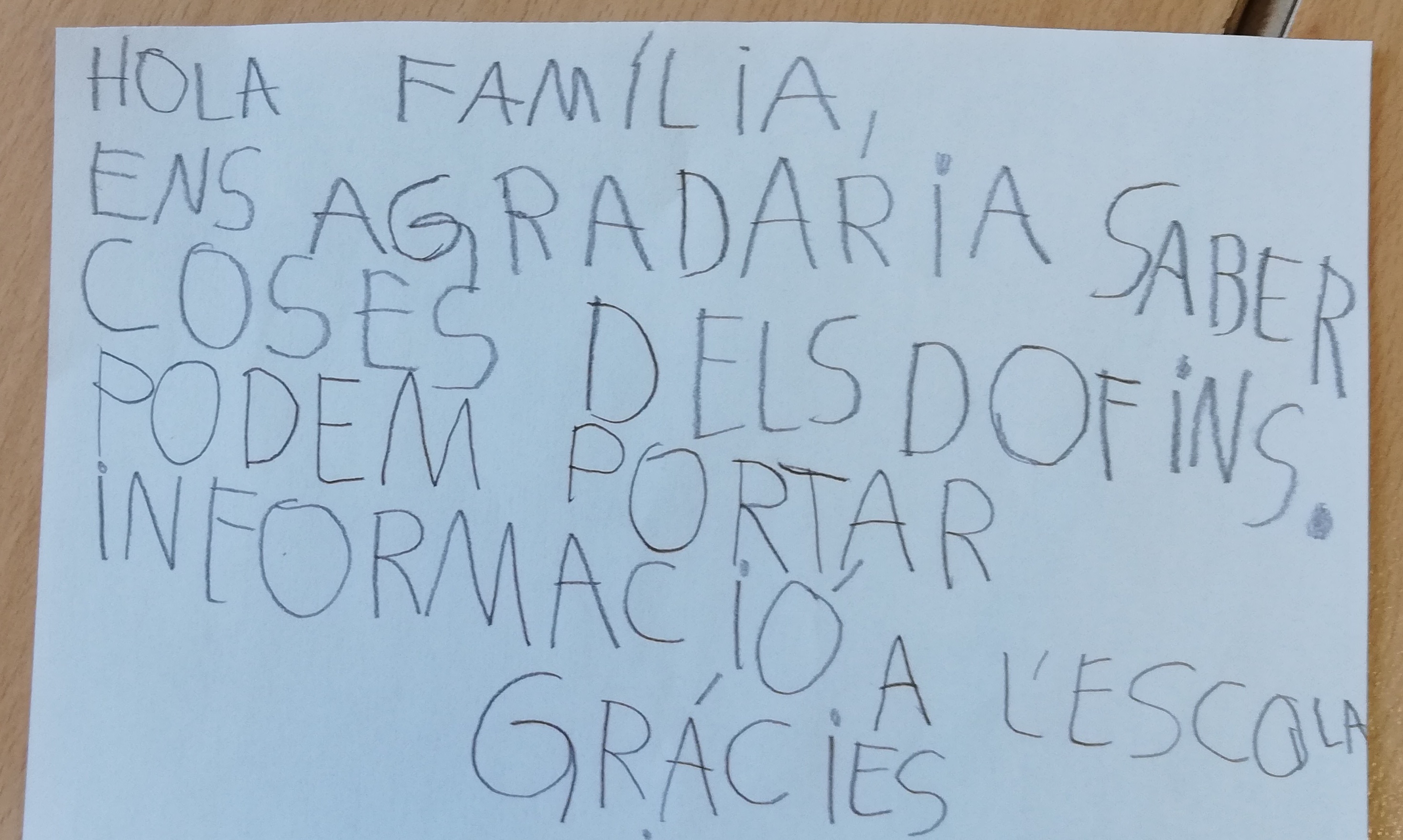 Aquest trimestre volem aprendre coses dels animals marins. Perquè ens podeu ajudar, avui us hem escrit una nota, que portem a dins del sobre, demanant-vos la vostra col.laboració. Podem portar contes d’animals marins, fotografies, vídeos, animals de joguina… Tot ens anirà molt bé! Tot i que parlarem de molts animals, però, cada classe ha decidit triar-ne un de concret per aprendre’n moltes més coses. Vam fer votacions i els trapezistes vam decidir que volíem saber coses de l’ORCA i els mags, dels DOFINS! Així que si teniu coses d’aquest dos animals, també ens aniran molt bé!!!
