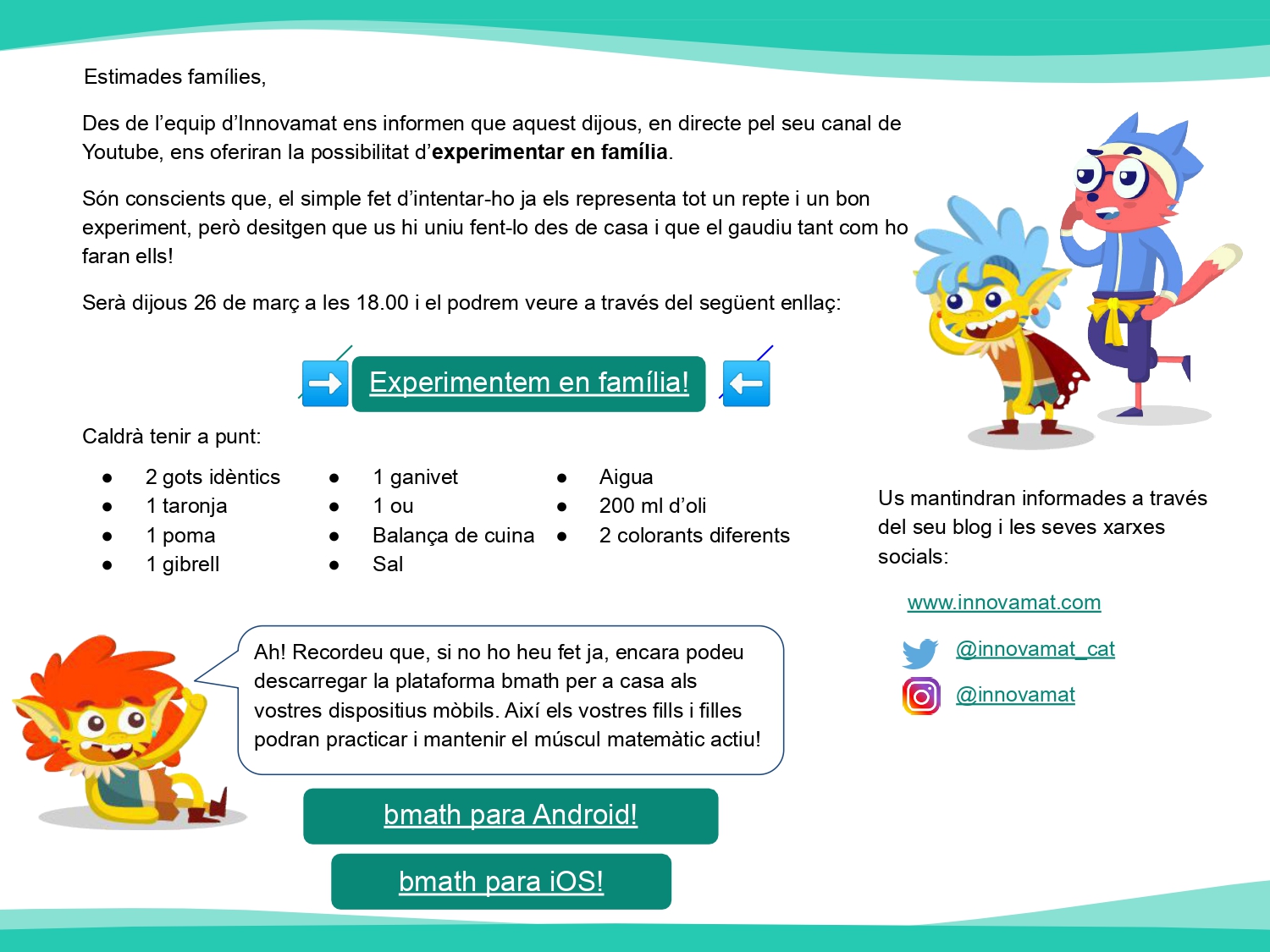 Els nostres companys d’Innovamat ens proposen un experiment, tants pels alumnes d’Infantil com de Primària, perquè puguem passar una estona plegats gaudint de la ciència.