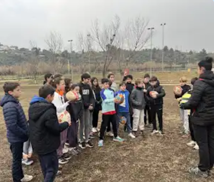 A la sessió de rugbi hem entrat en contacte amb les pilotes que s’utilitzen per practicar aquest esport, hem fet el moviment tècnic del placatge i hem fet diversos jocs per dominar les passades i recepcions.
