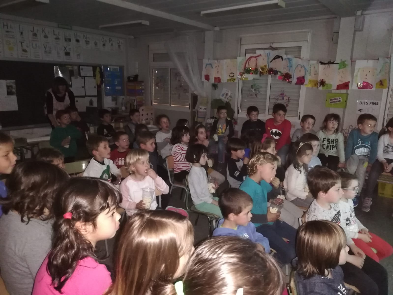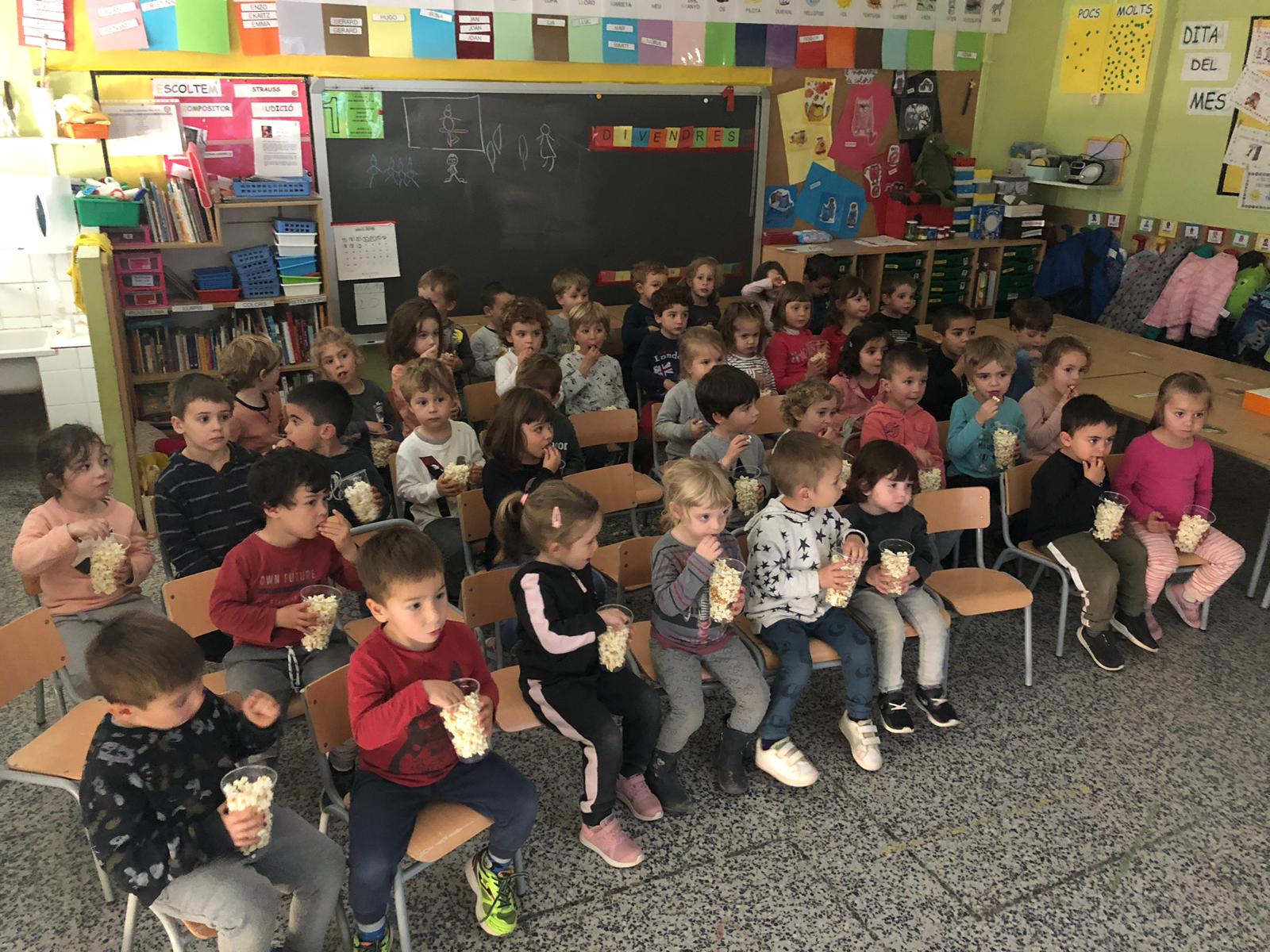 Aquesta tarda tots els alumnes d’educació infantil hem anat al cinema. No al cinema de Manresa! Sinó al cinema que ens han posat les mestres a les pissarres digitals. Ens hem ajuntat els dos grups de P3, els dos de P4 i els dos de P5.
