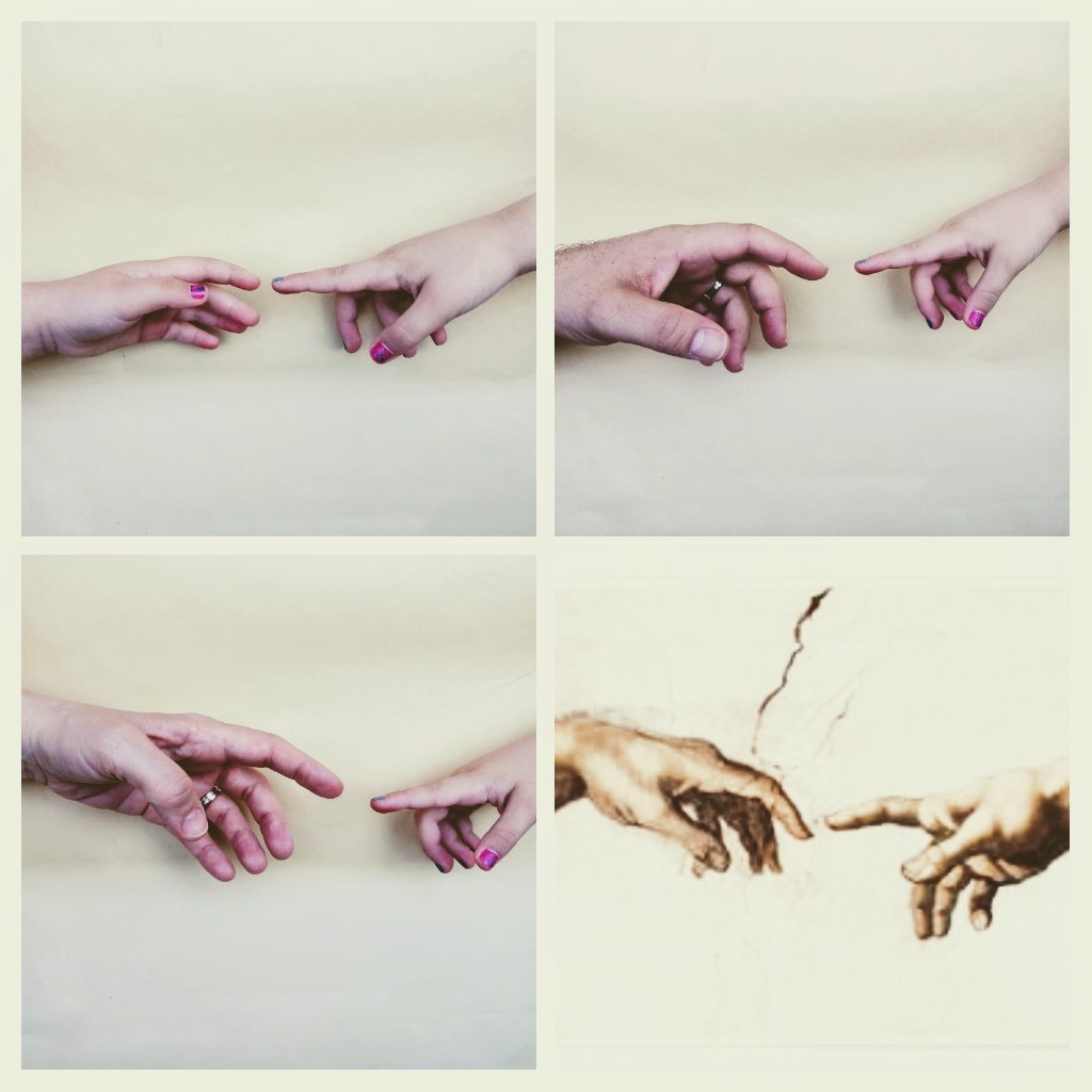 Aquesta família està recreant l’obra d’art “La Creació d’Adam”. És un fresc en la volta de la Capella Sixtina, pintat per Michelangelo Buonarroti l’any 1511.