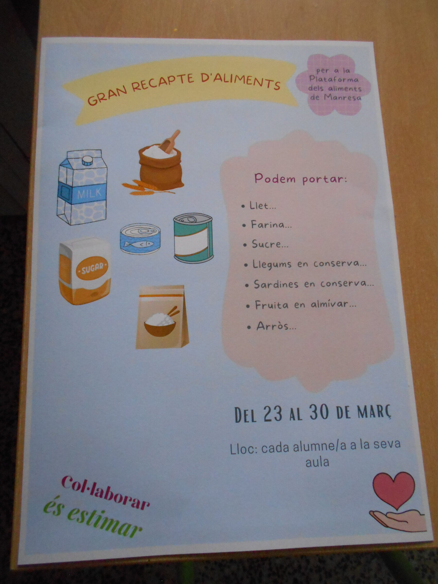 Hem fet uns CARTELLS per informar a tota l’escola de la campanya de RECOLLIDA D’ALIMENTS per a les famílies necessitades de Manresa del 23 al 30 de març.