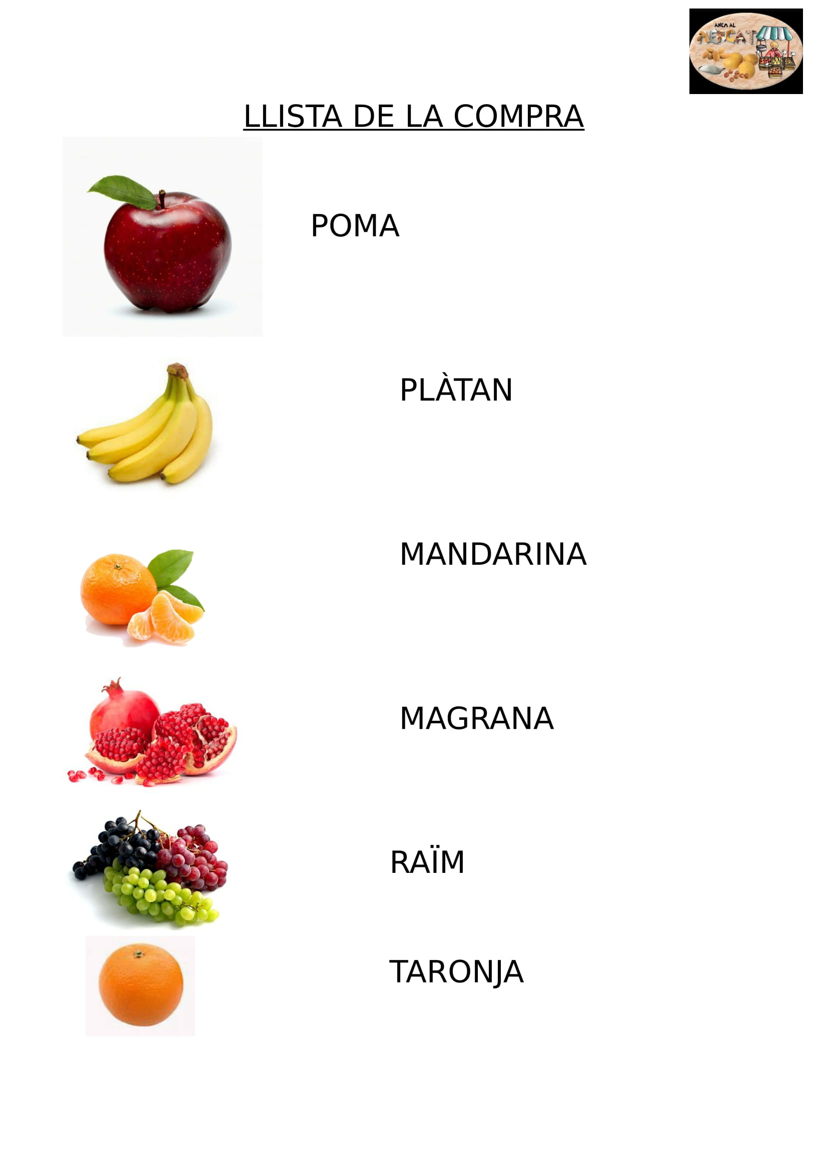 Famílies, com ja sabeu, fa uns setmanes que estem treballant la tardor. Hem fet activitats que ens han ajudat a conèixer els colors típics d’aquesta estació, hem après algun poema, hem gaudit de les tradicions pròpies d’aquesta època de l’any, hem escoltat contes, cançons… i, també, hem conegut les fruites típiques d’aquesta temporada. Amb fotografies, amb jocs, amb experimentacions i amb totes les fruites que heu anat portant a les classes les hem anat coneixent. Ara, el dijous, ens espera un matí ben entretingut al mercat de Sant Joan de Vilatorrada on anirem a comprar totes aquestes fruites de tardor per, després, l’endemà poder fer una macedònia de fruites ben bona per esmorzar!! De moment, entre tots i totes hem fet la llista de la compra.