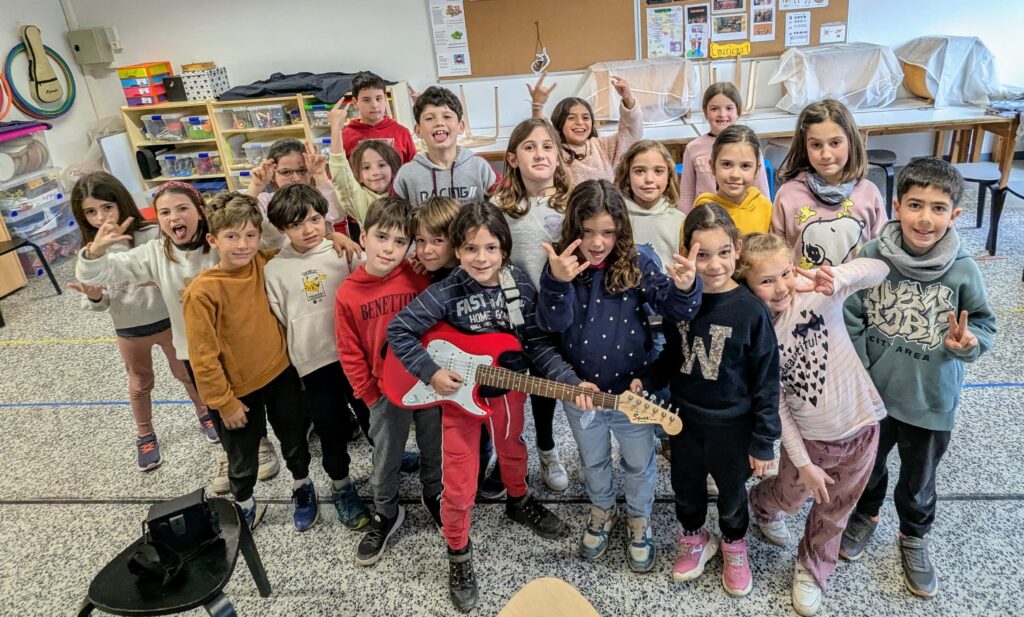 Avui hem tingut una sorpresa a la classe de música, ja que l’Aleix Paz ha portat la seva guitarra elèctrica, el seu amplificador, la pua i les partitures per oferir-nos una petita actuació en directe!