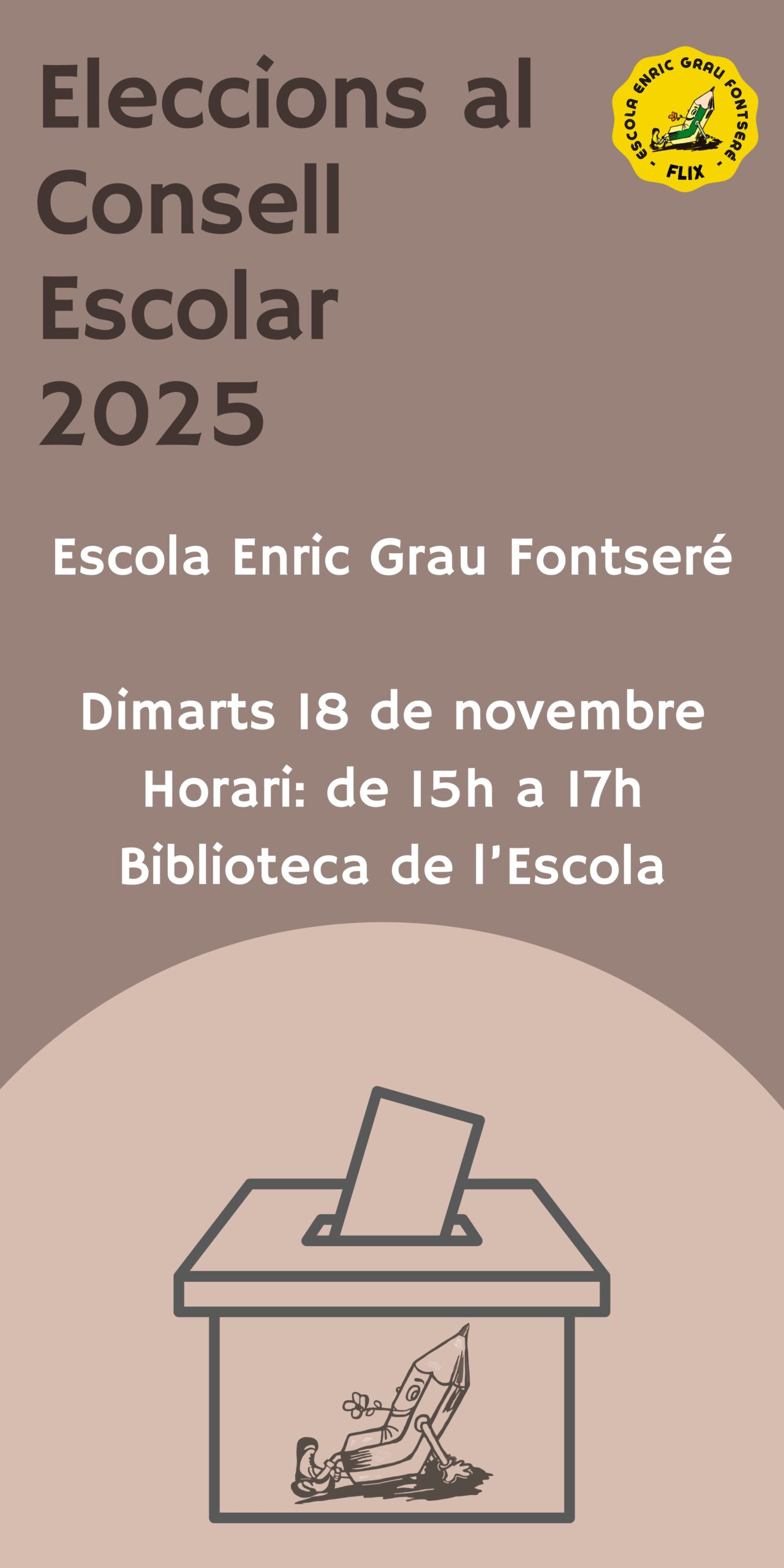 Les votacions s’iniciaran DEMÀ a les 15h a la Biblioteca de l’Escola fins les 17h. Recordeu portar el document d’identitat per a què els membres de la mesa electoral puguin realitzar un seguiment del cens.
