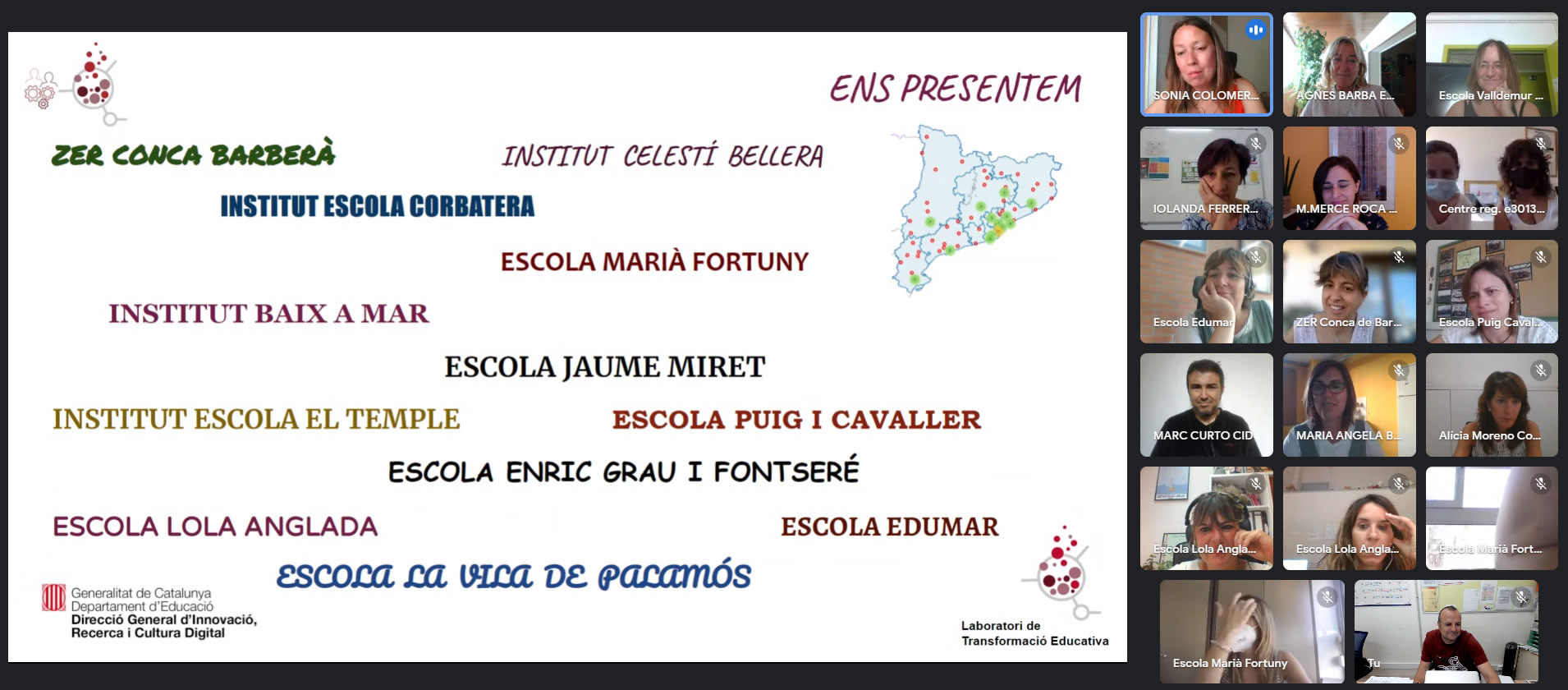 Aquest divendres 9 de juliol hem realitzat el primer contacte amb els 12 centres educatius que hem esdevingut (després del procés d’avaluació intern i extern) membres de la Comunitat de Centres Referents del Laboratori de Transformació Educativa.