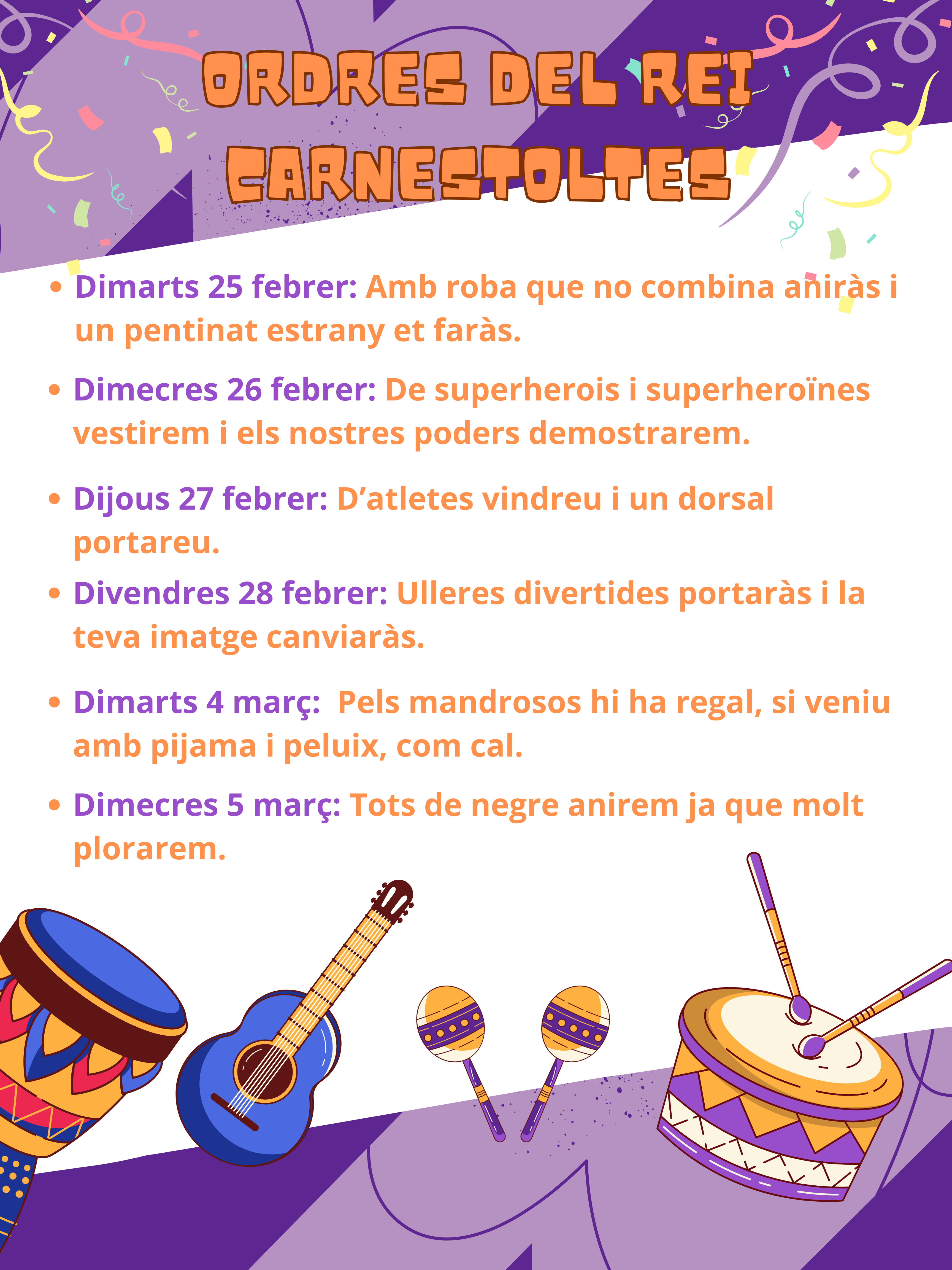 Avui a l’hora del pati l’alumnat de l’escola Òrrius ha sentit un xivarri i una xerinola que s’apropava a l’escola… què és?, on és?, qui és? EL REI CARNESTOLTES, els seus ajudants i la comitiva !!!! Ha arribat a l’escola per posar-la cap per avall! Ens ha fet un bon pregó i ens ha anunciat les consignes de la setmana.