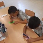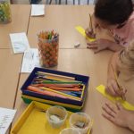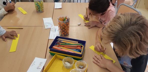 Desprès, cada taula ha escrit una part del cos. Quan les hem tingut totes, les hem posat a sobre una taula i les hem barrejat.