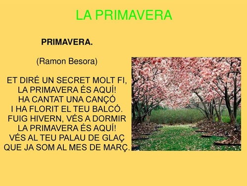 | Us deixem el poema de la primavera perquè el pugueu llegir i qui vulgui el pot memoritzar i si i us animeu podeu gravar-lo i ho envieu al whatsapp de l’escola i digues per quina paraula del mes canviaries març. Saps quin mes estem? S’està acabant…