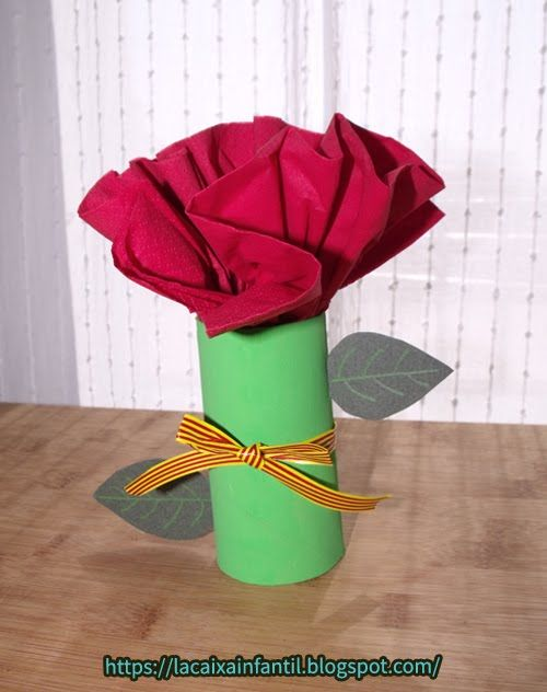 Per fer aquesta rosa cal: – un tub de paper de vàter – un tovalló vermell – colors, pintura de color verd – paper o cartolina verda – un tall de cinta de senyera catalana o una tira blanca de paper i la pintes amb 4 línies vermelles i 5 de grogues