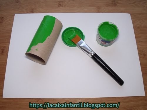 Pas a pas: Enganxes el paper de color verd o pintes el rotlle de paper higiènicde color verd amb retolador o colors o amb pintura i el deixes secar.