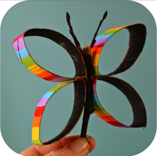 | Fes un papallona amb tires de rotlle de paper de wàter i la pintes i per fer el cos, hi enganxes una branqueta o una agulla d’estendre roba o un cartró… Quan ho hagis fet, envies la foto a: afalguer@xtec.cat