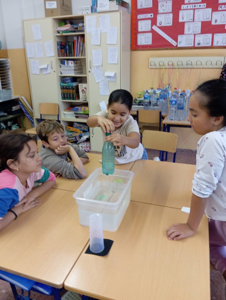 Hem fet diversos experiments on hem pogut comprovar algunes de les propietats de l’aigua i l’aire i molt curiosament hem descobert que sempre es posen d’acord en entrar i sortir, per exemple quan es buida un recipient es forma un remolí perquè l’aire circula pel centre i l’aigua per la vora o superfície d’aquest recipient…a casa passa en les piques de cuina i bany quan entra l’aigua surt l’aire… i ens hem fet mes conscients que l’aire tot i que no es veu ocupa un espai…