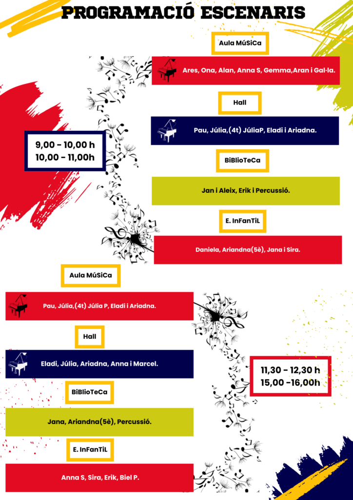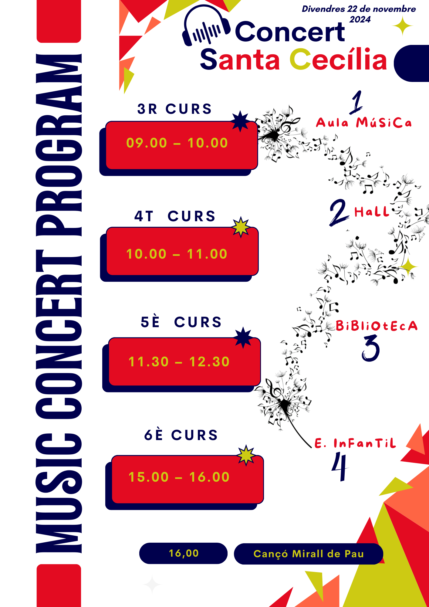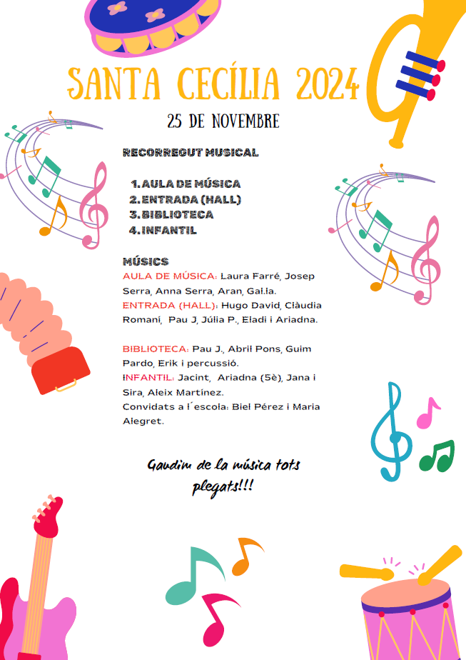 El dia 25 de novembre continuarà la celebració i serà el torn dels més petits de l’escola. Els nens d’Educació Infantil i Cicle Inicial seran els protagonistes de la jornada i podran gaudir de diferents actuacions musicals. El programa d’aquesta jornada és el següent: