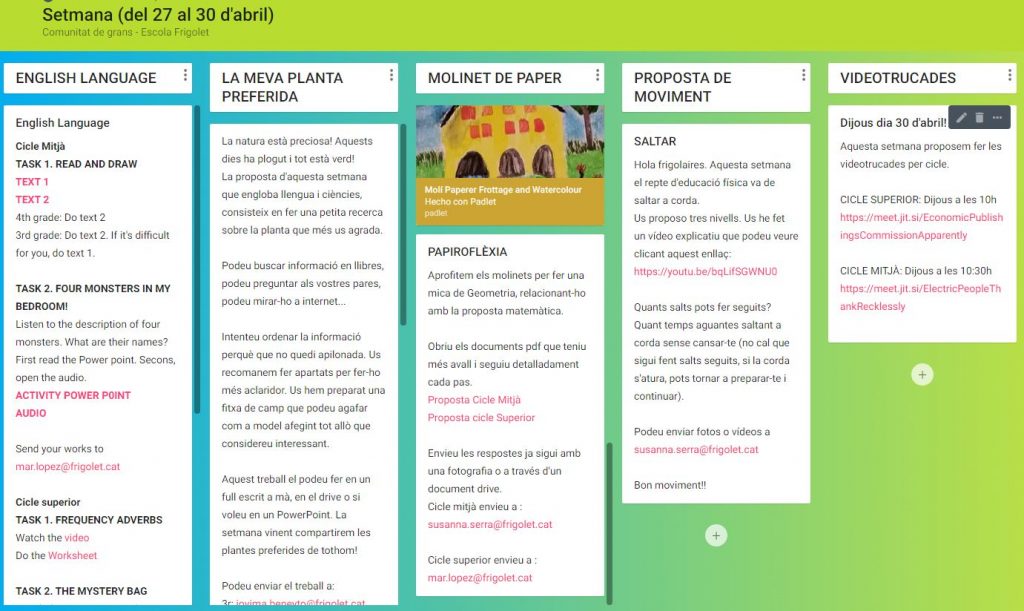 BON DIA COMUNITAT DE GRANS!!!!! Comencem l’última setmana d’abril. Aquesta vegada veureu que el pla de treball és una mica diferent. Les propostes de llengua i ciències s’han convertit en una única tasca i les propostes de matemàtiques i art visual, també. Recordeu que aquesta setmana és de quatre dies. Divendres és 1 de maig