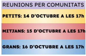 17/10/24Aquesta setmana estem fent les reunions de famílies de les diverses comunitats: petits (i3, 14, 15), mitjans (1r, 2n, 3r) i grans (4t, 5è, 6è).