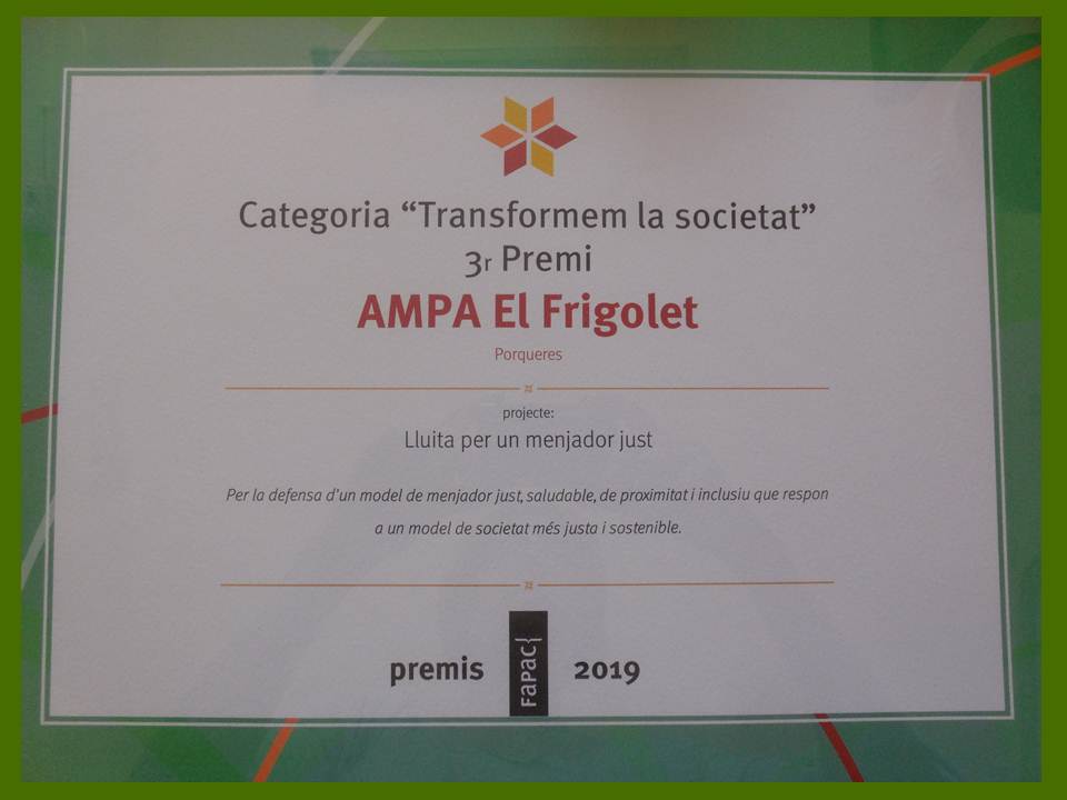 Cada any, la FAPAC (Federació d’associacions de mares i pares d’alumnes de Catalunya) lliura un premi en reconeixement a les activitats i projectes de les AMPES de tota Catalunya. Aquest any l’AMPA de la nostra escola ha estat guardonada amb un tercer premi pel seu projecte per defensar un menjador just, saludable i sostenible.