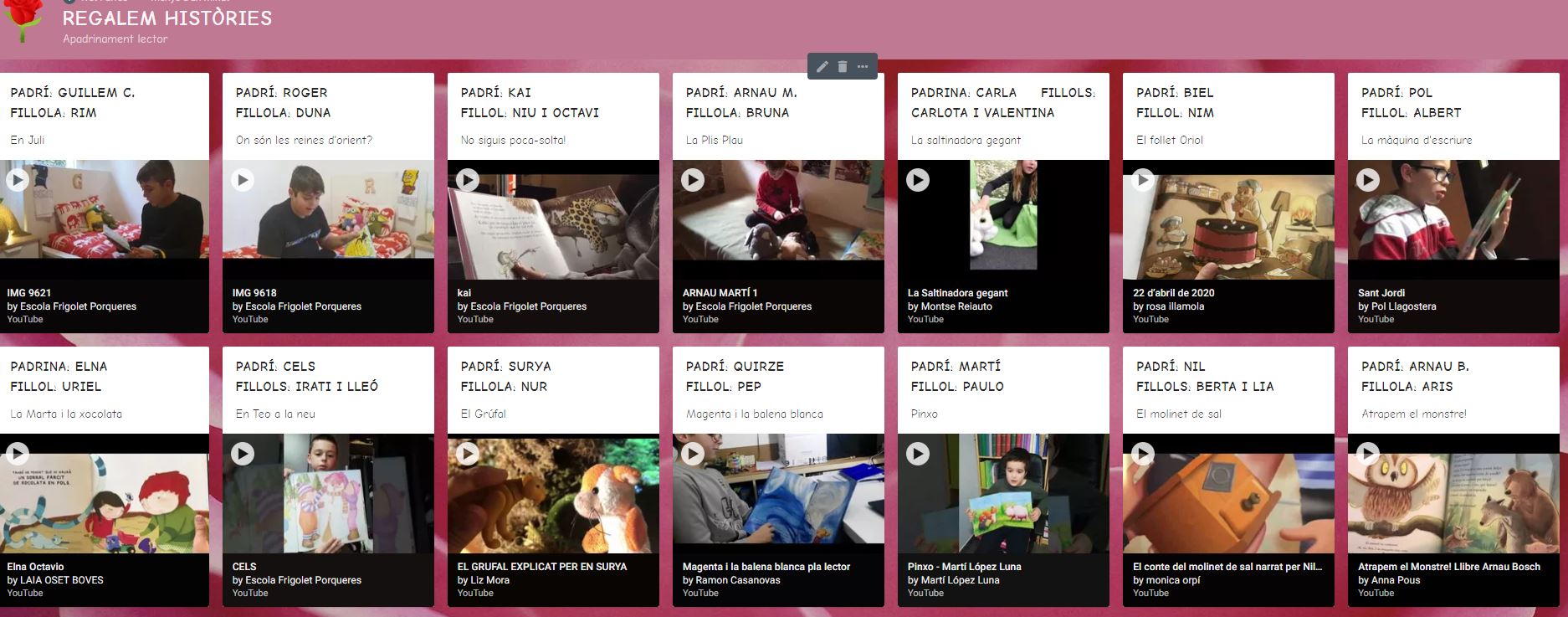 Ens fa molta il·lusió regalar bones lectures per Sant Jordi. Per fer-ho possible, els nens i nenes de la comunitat de grans han preparat pels nens i nenes de la comunitat de petits la lectura d’un conte que els hi agrada molt. Cada padrí i padrina ho ha fet pensant en el seu fillol o fillola. Tot i així, volem compartir les històries de tots i totes perquè si us ve de gust, pugueu continuar escoltant.