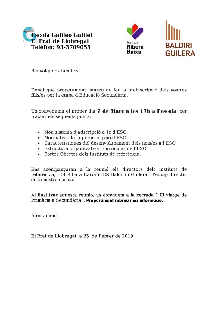 FAMÍLIES DE 5è i 6è !!! Us esperem el proper 7 de Març a les 17.30 h a l’escola, per gaudir de la xerrada “EL VIATGE DE PRIMÀRIA A SECUNDÀRIA”, a càrrec del professor i formador, el Sr. Antoni Argent. https://www.elprat.cat/la-ciutat/guia-agenda/el-viatge-de-primaria-secundaria