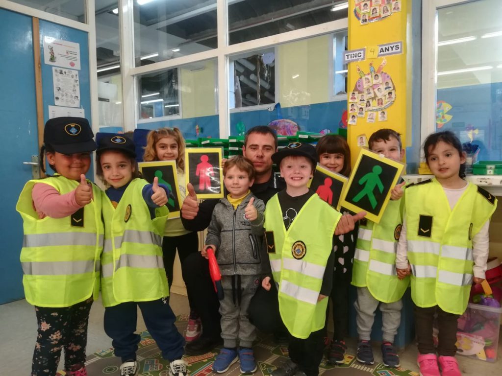 Les papallones de P4A i els Indis de P4B, han rebut la visita de l’ Herminio, el policia local més conegut del Prat. L’Herminio ens ha fet un taller d’educació vial i hem après a creuar el carrer, mirar els semáfors, la seguretat en el cotxes dels pares a través de contes, videos i teatre.