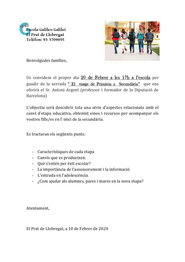 Benvolgudes famílies, Us convidem el proper dia 20 de Febrer a les 17h a l’escola per gaudir de la xerrada “ El viatge de Primària a Secundària” que ens oferirà el Sr. Antoni Argent (professor i formador de la Diputació de Barcelona) L’objectiu serà descobrir tota una sèrie d’aspectes relacionats amb el canvi d’etapa educativa,