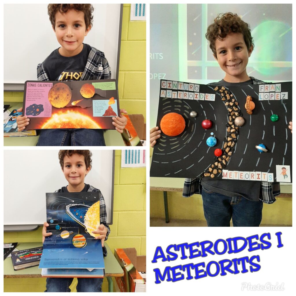 En Fran ens ha explicat avui un munt de coses sobre meteorits, meteors i asteroides. Ens ha mostrat que són trossos de roques que viatgen per l’espai i que poden ser tan grans com una muntanya o petits com una pedreta. Sabíeu que entre Mart i Júpiter hi ha un Cinturó d’asteroides? Impressionant. A més