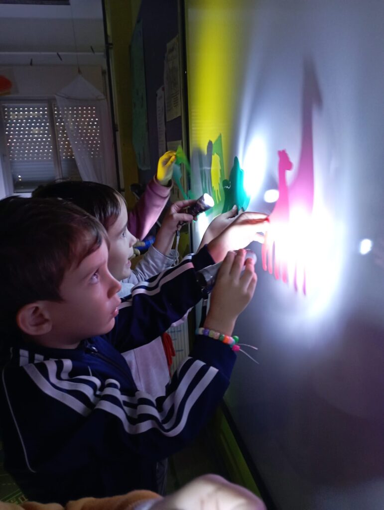 Gaudim amb la llum i la foscor. Descobrim les ombres dels objectes, construïm amb peces lluminoses, barregem llums de colors i manipulem en la taula en la llum. Voleu saber que han dit els infants durant aquesta sessió: “Amb les llanternes veiem la llum de les peces”, “ Es veu de color lila!!!” ,“Es veu