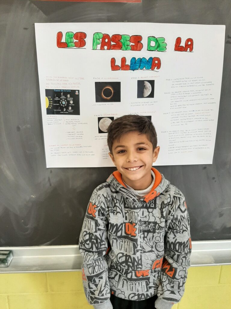 En Jose ens ha explicat avui les fases de la Lluna. Si alguna vegada hem pensat que la Lluna creix, es fa petita o desapareix, estàvem equivocats! La Lluna té 4 fases diferenciades que depenen de la seva situació respecte al Sol i la Terra. Sabíeu que la Lluna també fa moviment de rotació i