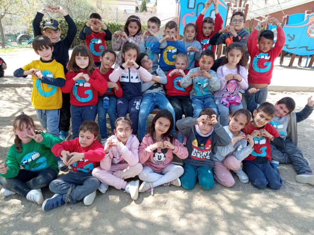 Aquesta tarda, els nens i les nenes de primer i segon ens hem pogut juntar a les grades del pati amb els companys i companyes d’Educació Infantil per celebrar el certamen de Sant Jordi.