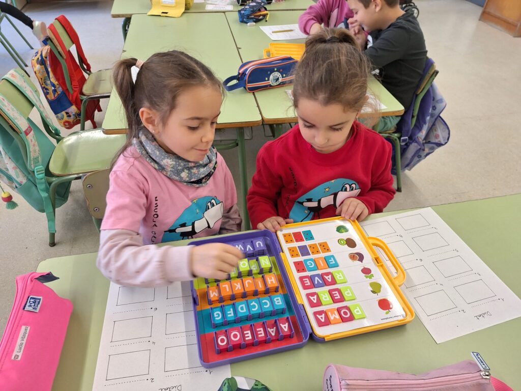Els nens i nenes de 1r ens fem especialistes de les lletres. Aprenem moltíssim realitzant els racons de llengua: Donem de menjar als monstres de lletres, paraules que contenen la seva lletra preferida, pensem paraules amb una lletra i les escrivim a la pissarreta magnetica. Fem servir el joc de “Ara aprenc”, etc. No parem!