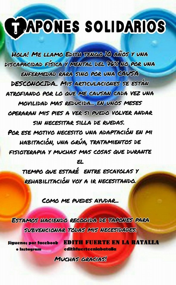 L’Edith té 10 anys i una discapacitat física i mental del 76%, no per una malaltia rara ,sinó per una causa desconeguda. Les seves articulacions s’estan atrofiant ,motiu pel qual ,cada cop té una mobilitat més reduïda. En uns mesos operaran els seus peus per veure si pot tornar a caminar sense la cadira […]