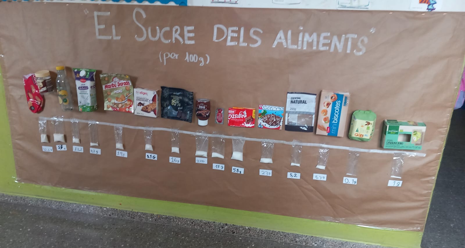 A quart hem realitzat un seguit d’activitats com a cloenda de la funció de nutrició “L’aparell digestiu i els nutrients “, centrades en la lectura d’etiquetes, amb especial atenció al sucre afegit dels aliments. Per dur a terme l’activitat, hem mesurat la quantitat de sucre present en diversos productes utilitzant una bàscula.