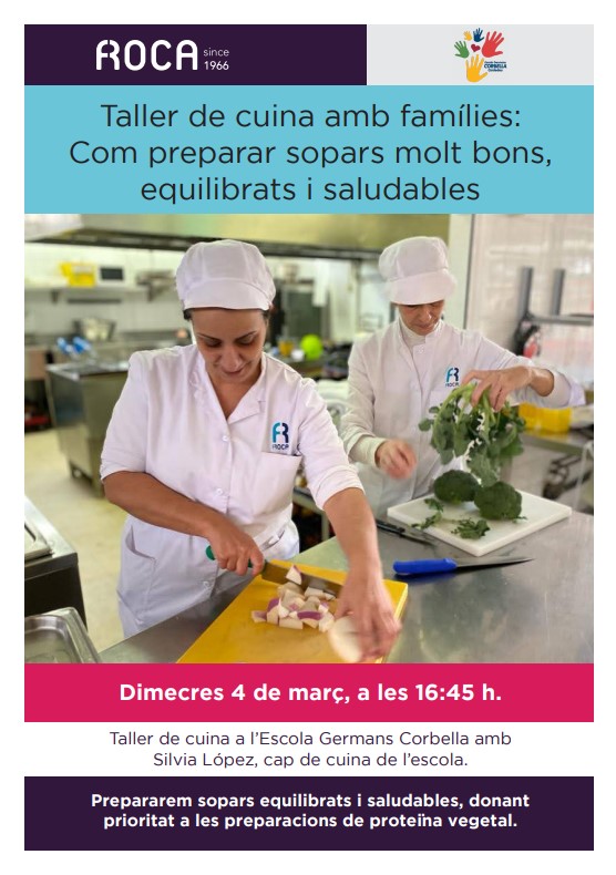 Benvolgudes famílies, El pròxim dimecres 4 de març a les 16:45 farem un taller de la mà de F. ROCA. Aprendrem com, d’una manera senzilla, podem preparar sopars molt bons, equilibrats i saludables en família. Podeu inscriure-us enviant un correu electrònic a l’Elisabet (coordinadora del Servei Migdia) a germanscorbella@rocadino.cat. Les 15 primeres persones que reservin plaça seran