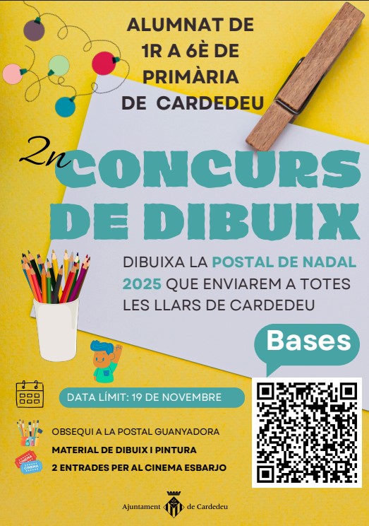 Des de la regidoria d’educació ens envien aquesta informació del 2a edició del Concurs de Dibuix Postal de Nadal 2025, adreçat a l’alumnat de primària. La postal guanyadora serà la imatge de la felicitació de Nadal que l’Ajuntament de Cardedeu enviarà a totes les llars de la vila. El termini per participar-hi és el 19 de novembre.