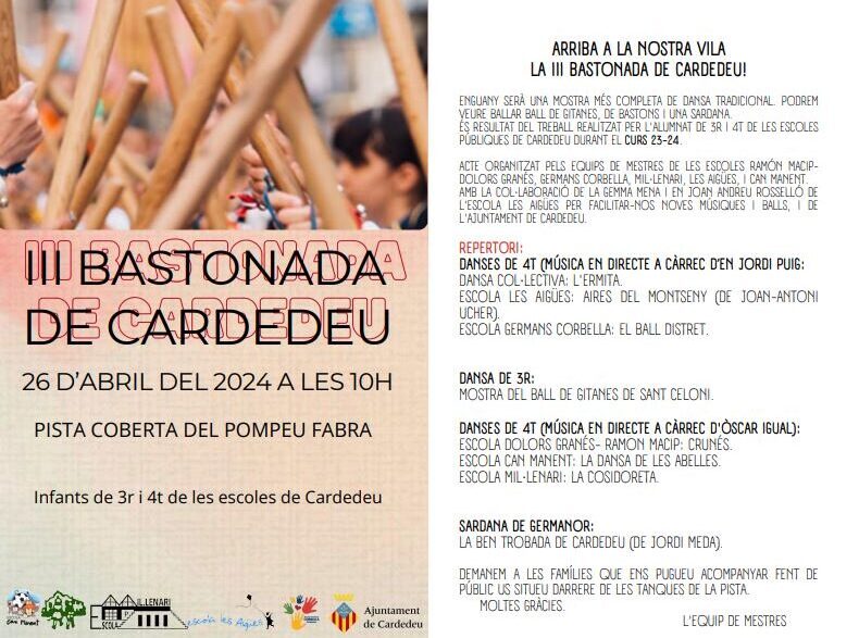 3r i 4t_Bastonada i Ball de Gitanes (Cardedeu)Per admin / 25 d'abril de 2024 / 3r 4t Àrees General Música Portada Primària / Activitats, Promoció 23-24 Benvolgudes famílies de 3r i 4t, Aquí us fem arribar el programa de mà de l’acte de la III Bastonada de Cardedeu prevista per demà a la Pista Coberta del Parc Pompeu Fabra de Cardedeu.