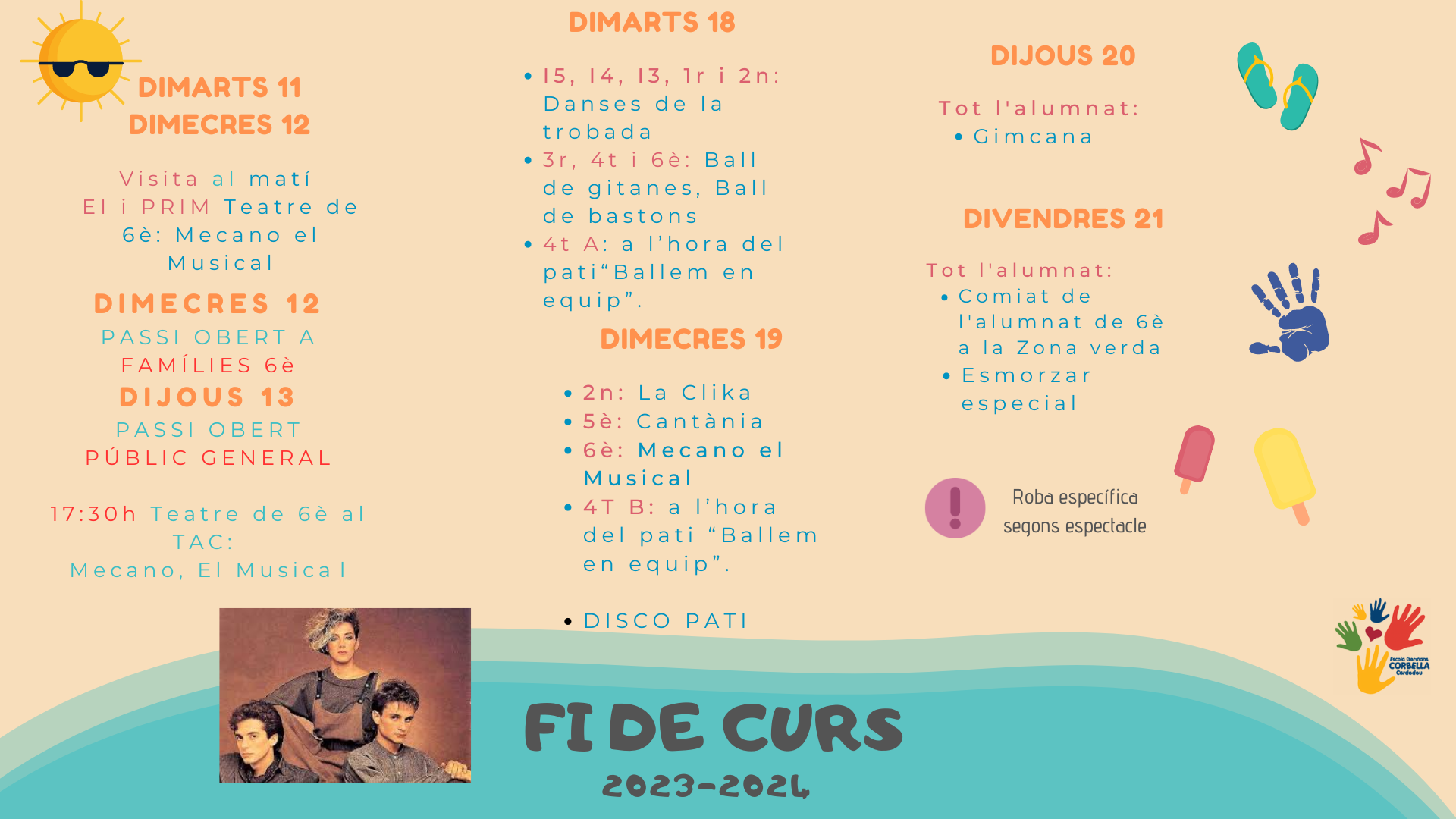 La setmana vinent ja tenim la representació de MECANO, el musical per part dels infants de 6è. L’alumnat d’educació infantil anirà a l’assaig general de dimarts 11 al matí, i el de primària a l’espectacle del dimecres 12 al matí. Dimecres 12 a la tarda es farà la representació per a les famílies de 6è i dijous 13 la representació per a públic en general.