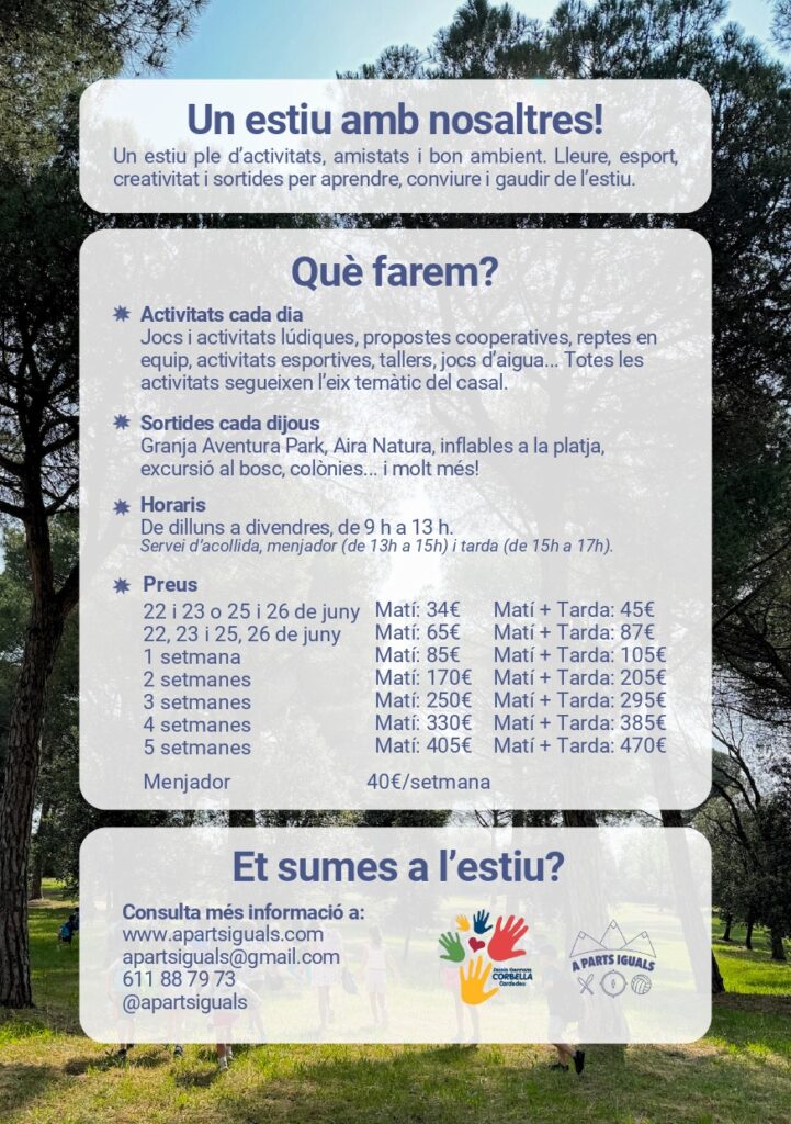 Us fem arribar la informació dels casals d’estiu 2026 de Cardedeu. Aquest estiu per segon any consecutiu podrem comptar amb casal d’estiu a la nostra escola del 22 de juny al 31 de juliol amb l’empresa A Parts iguals.