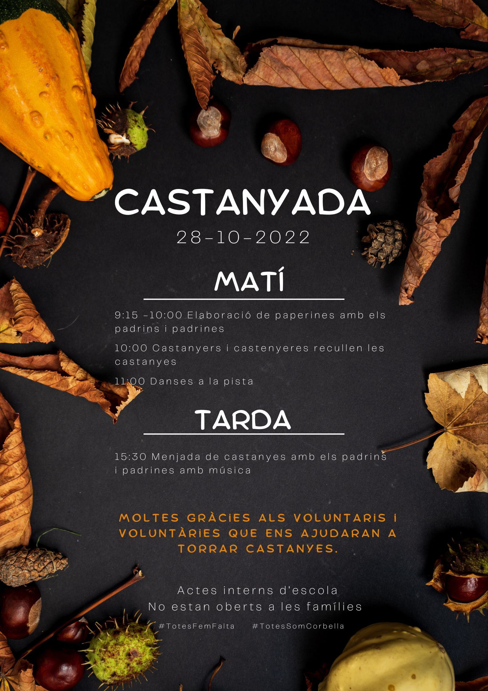 Castanyada 2022Per admin / 21 d'octubre de 2022 / 2n 3r 4t 5è 6è Festes General I3 I4 I5 Infantil Portada Primària / Castanyada, Festes, promoció 22-23 Benvolgudes famílies, S’acosta la Castanyada i ja tenim el programa d’actes interns de centre: Bona Castanyada! Comissió de festes