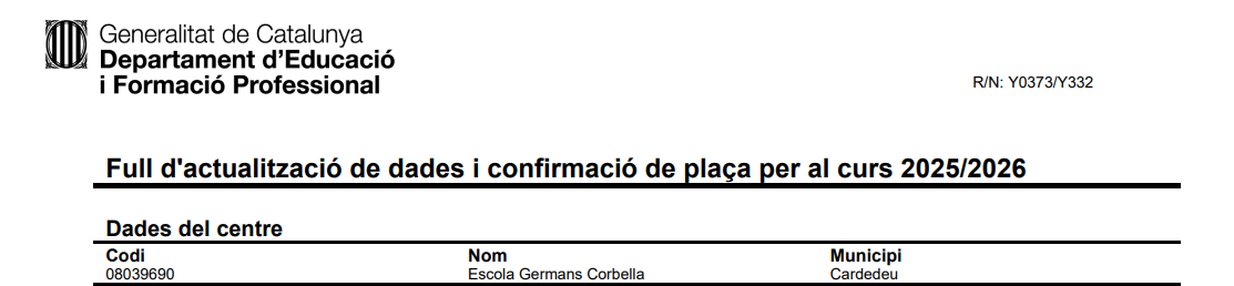 Avui dimarts 22 d’abril us farem arribar el full de confirmació de plaça i actualització de dades per al curs 2025-2026. Caldrà retornar-lo revisat, omplert i signat als tutors o tutores dels vostres fills i filles. L’últim dia per retornar-lo és dimecres 30 d’abril.