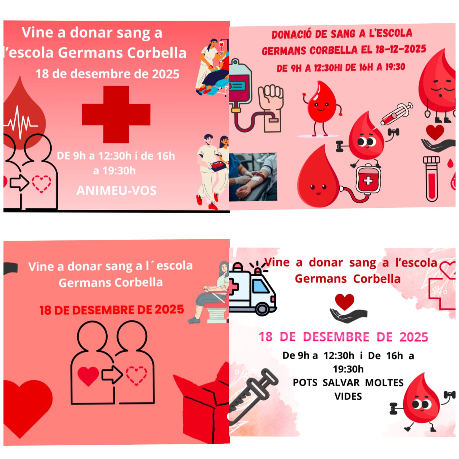 Donació de sang. Dijous 18 de desembrePer admin / 17 de desembre de 2025 / 1r 2n 3r 4t 5è 6è Altres activitats Festes General I3 I4 I5 Infantil Portada Primària / Activitats, Banc de sang, Donació de sang, Nadal, Promoció 25-26 Benvolgudes famílies, Animeu-vos a venir a donar sang! Dijous 18 de desembre. Cartells elaborats pels infants de 4t A i B.