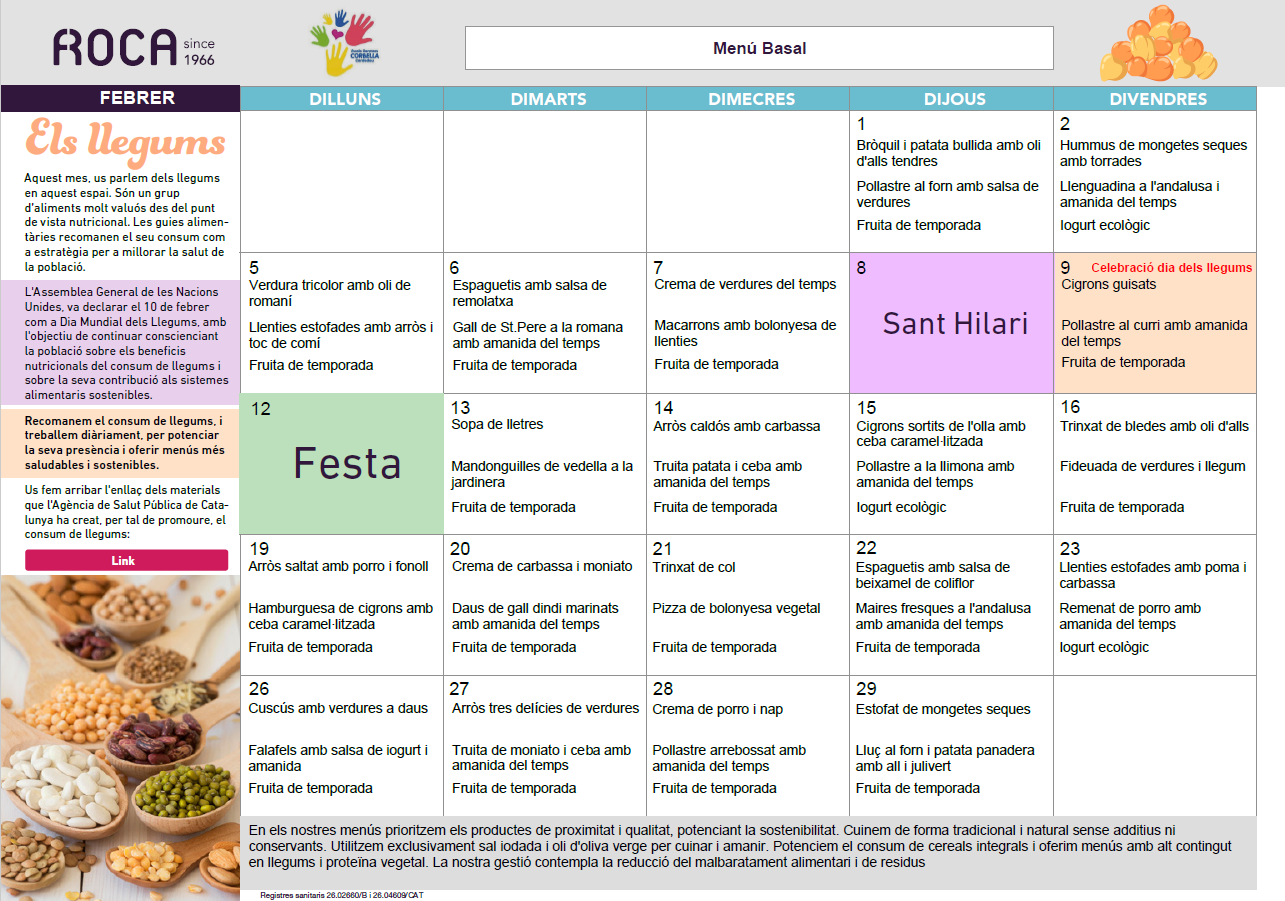Us fem arribar els menús del mes de febrer. Recordeu que aquest 8 de febrer hi ha la sortida a Sant Hilari i el dia 12 serà festiu. Com a novetat el proper 9 de febrer des del menjador celebrarem el dia dels llegums, aquest grup d’aliments tant valuós des del punt de vista nutricional. Feu clic aquí per veure totes els menús del mes de febrer.