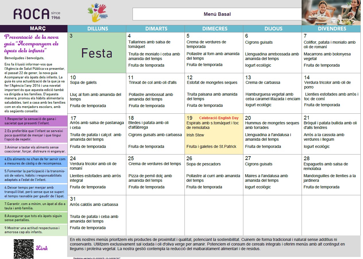 Menú mes de març 2025Per admin / 3 de març de 2025 / 1r 2n 3r 4t 5è 6è General I3 I4 I5 Infantil Menjador Portada Primària / Menjador, menú, promoció 24-25 Benvolgudes famílies, Us fem arribar els menús del mes de març.
