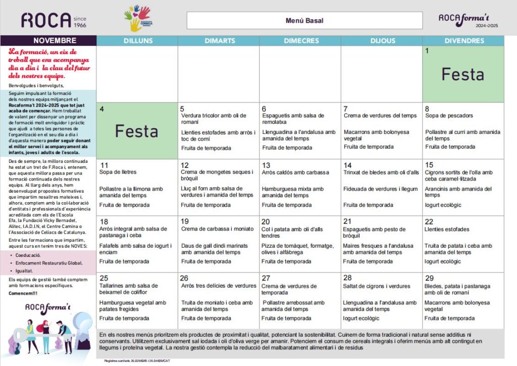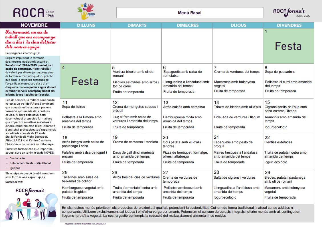 Menú novembre 2024Per admin / 5 de novembre de 2024 / 1r 2n 3r 4t 5è 6è General I3 I4 I5 Infantil Menjador Portada Primària / Menjador, menú, promoció 24-25 Benvolgudes famílies, Us fem arribar els menús del mes de novembre.