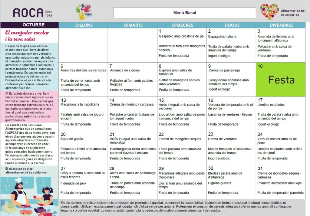 Menús octubre 2025Per admin / 29 de setembre de 2025 / 1r 2n 3r 4t 5è 6è General I3 I4 I5 Infantil Menjador Portada Primària / Menjador, menú Benvolgudes famílies, En aquest enllaç podreu trobar els menús del mes d’octubre.